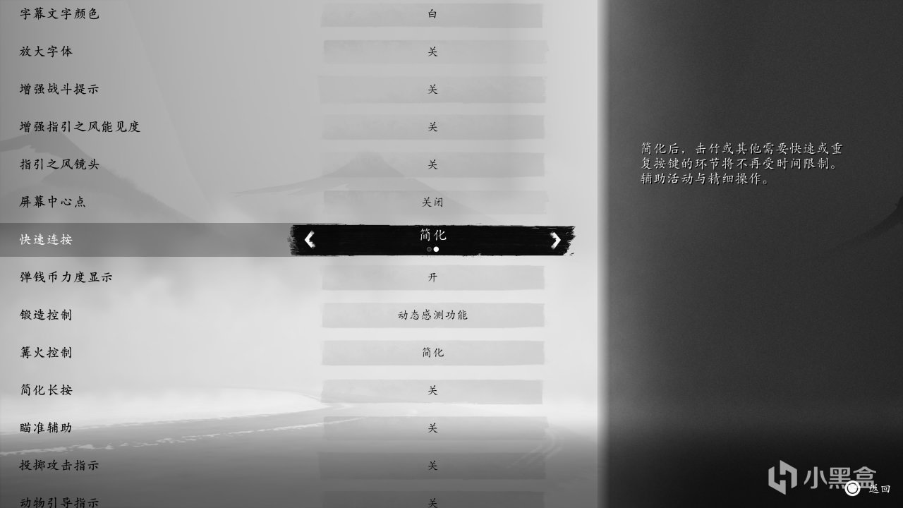 简易击竹。这个就是针对手残玩家用的了,反正我承认我在《对马岛之魂》就被击竹整的不要不要的,我选择不再折磨自己,开启了简易击竹之后,只需要按顺序正确按下按键即可完成击竹,不再有时间限制。