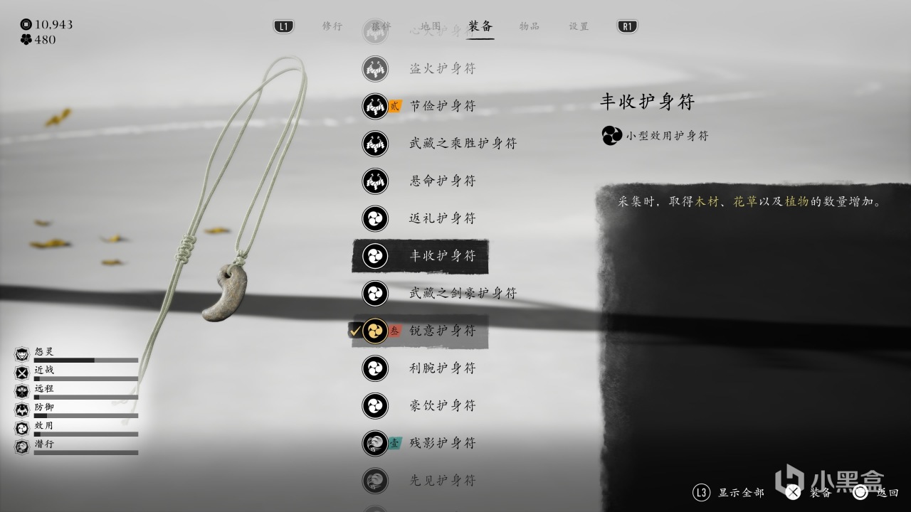 作为一款要素拉满的标准RPG游戏,《羊蹄山之魂》自然少不了收集资源升级装备的套路,而丰收护身符就是离我们收集资源的好帮手,其效果是取得木材、花草以及植物的数量增加,实测这个数量增加还是相当可观的,因此我几乎是全程带着丰收护身符。后期还有对应普通、稀有金属及火药数量增加的金屋子护身符也是不错的选择。