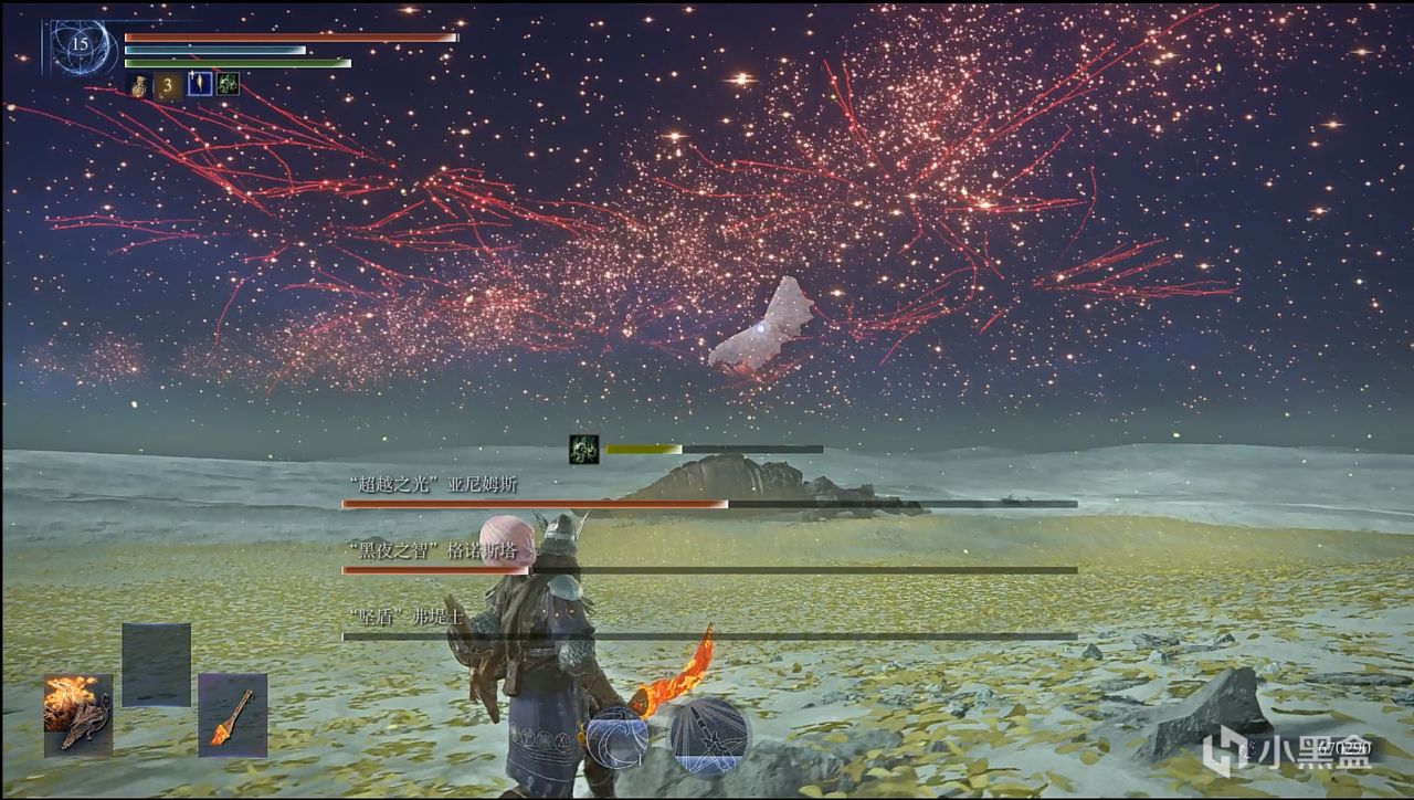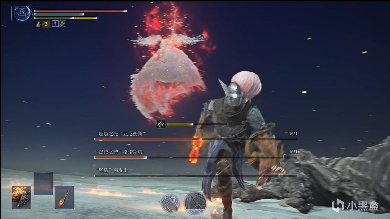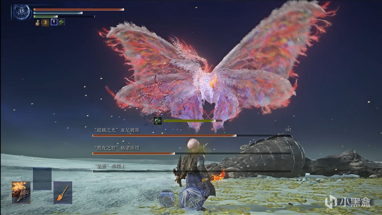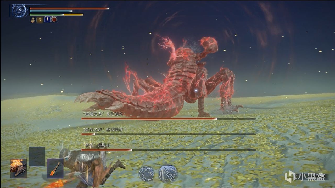 蛾子被附身之后也会在红蛾离体前开大,前摇也是飞上天,但是以一种比较疯癫的状态向天上散发魔法弹。由于这招是部分随机,部分跟踪的,且持续时间较长,虫子的身体挡不住,因此,这招最稳妥的处理办法分为以下几步:看到前摇(一飞上天),立马远离(起码一个钩锁跳的距离),大概是蛾子向上撒魔法弹时,你要改变成走动状态用来回精力,同时扭头锁定蛾子,看到第一个追踪的红色魔法弹靠近你时开始向左或右慢跑,一直慢跑直到魔法弹全部落完,再以尽量快的速度靠近蛾子(这个动作的目的待会会说)。如果你这样躲,照道理来说,你不需要翻滚,只需要两管精力条即可完全躲避