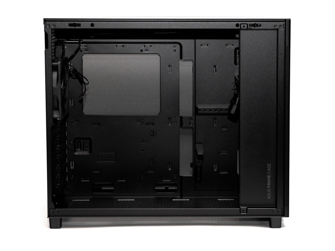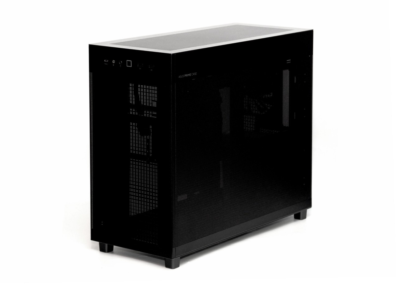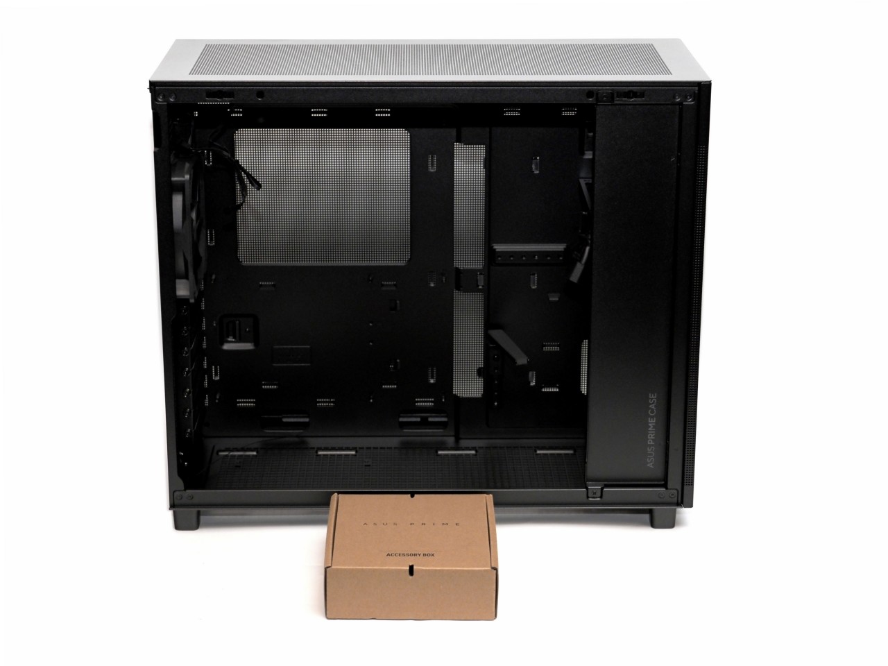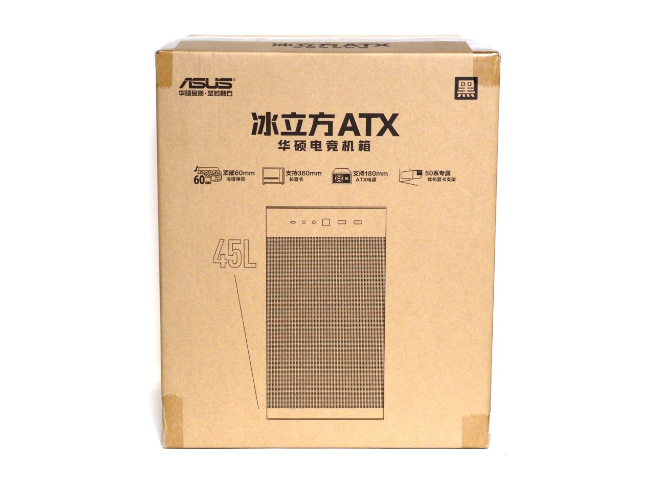 因此机箱思来想去,决定来一波返璞归真,主打一个散热为主颜值为辅,华硕的AP303冰立方ATX。之前的AP201就是MATX机箱里的散热能手,全是洞洞,但是作为MATX机箱来说有点偏大,这次的AP303在201的基础上略微增大了一点点支持了ATX主板,体积一下就显得很合适了,算是比较小巧的ATX机箱,同时依然保留了洞洞流的强大散热能力: