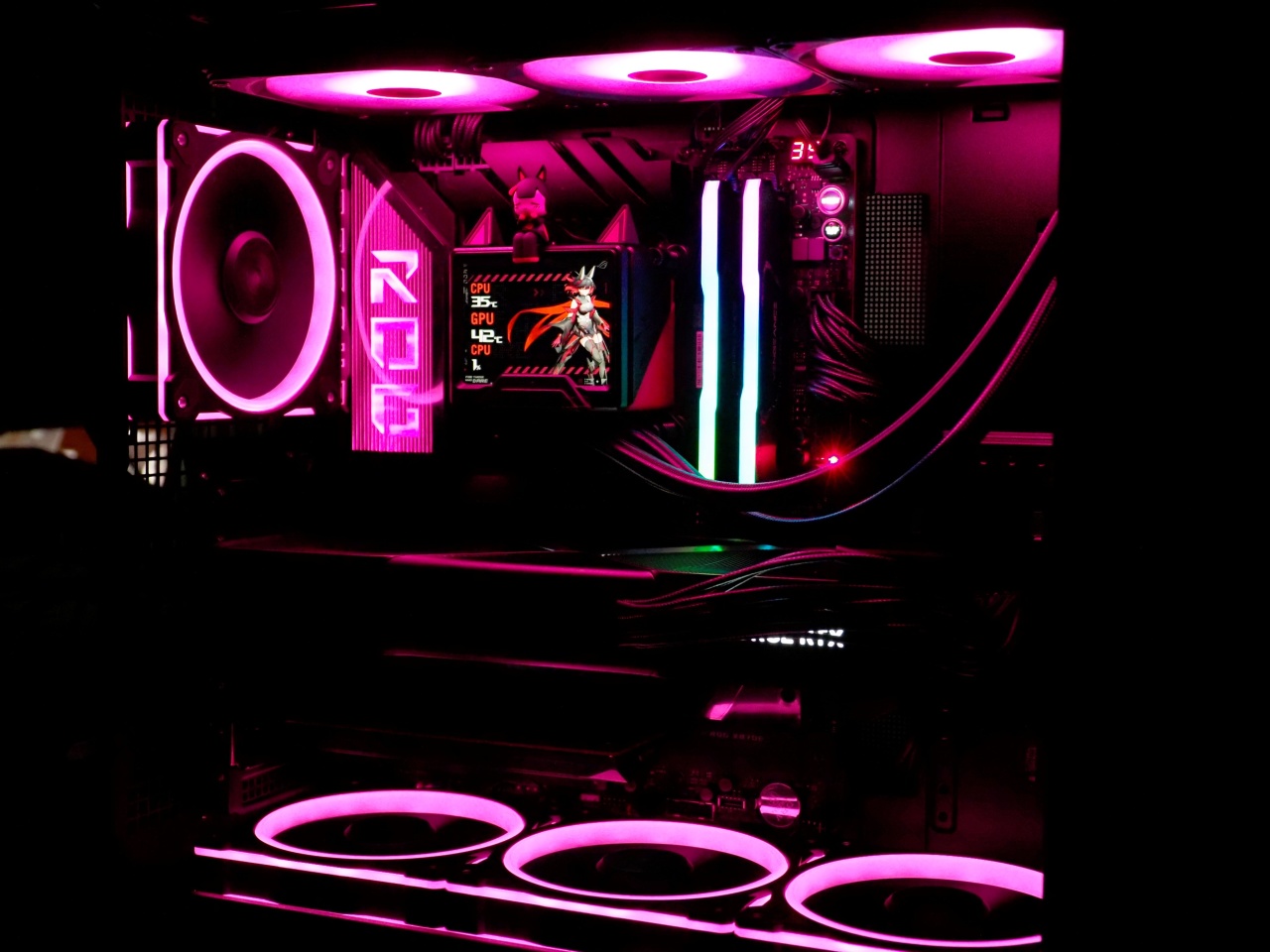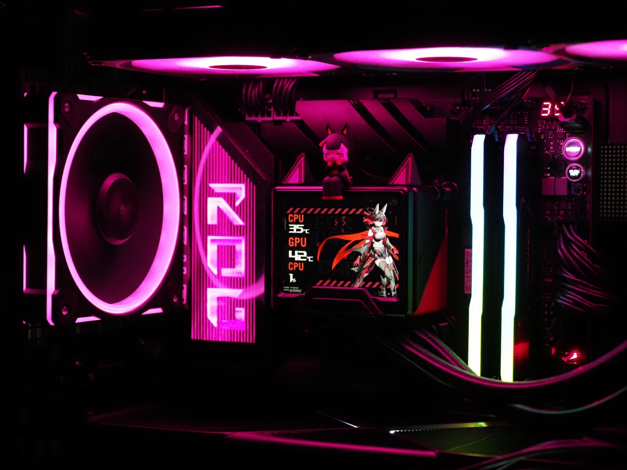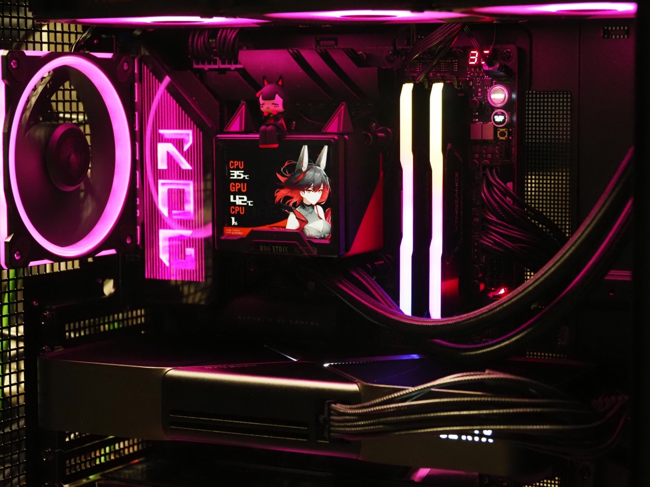 CPU散热器用的是新出的ROG STRIX RO姬 360LCD,这散热器我只能评价为,完全是RO姬的一个周边产品,细节拉满,华硕的设计理念真的是完全领先业界2年以上,至于散热能力什么的,对锐龙来说根本不重要,不超频都是溢出!