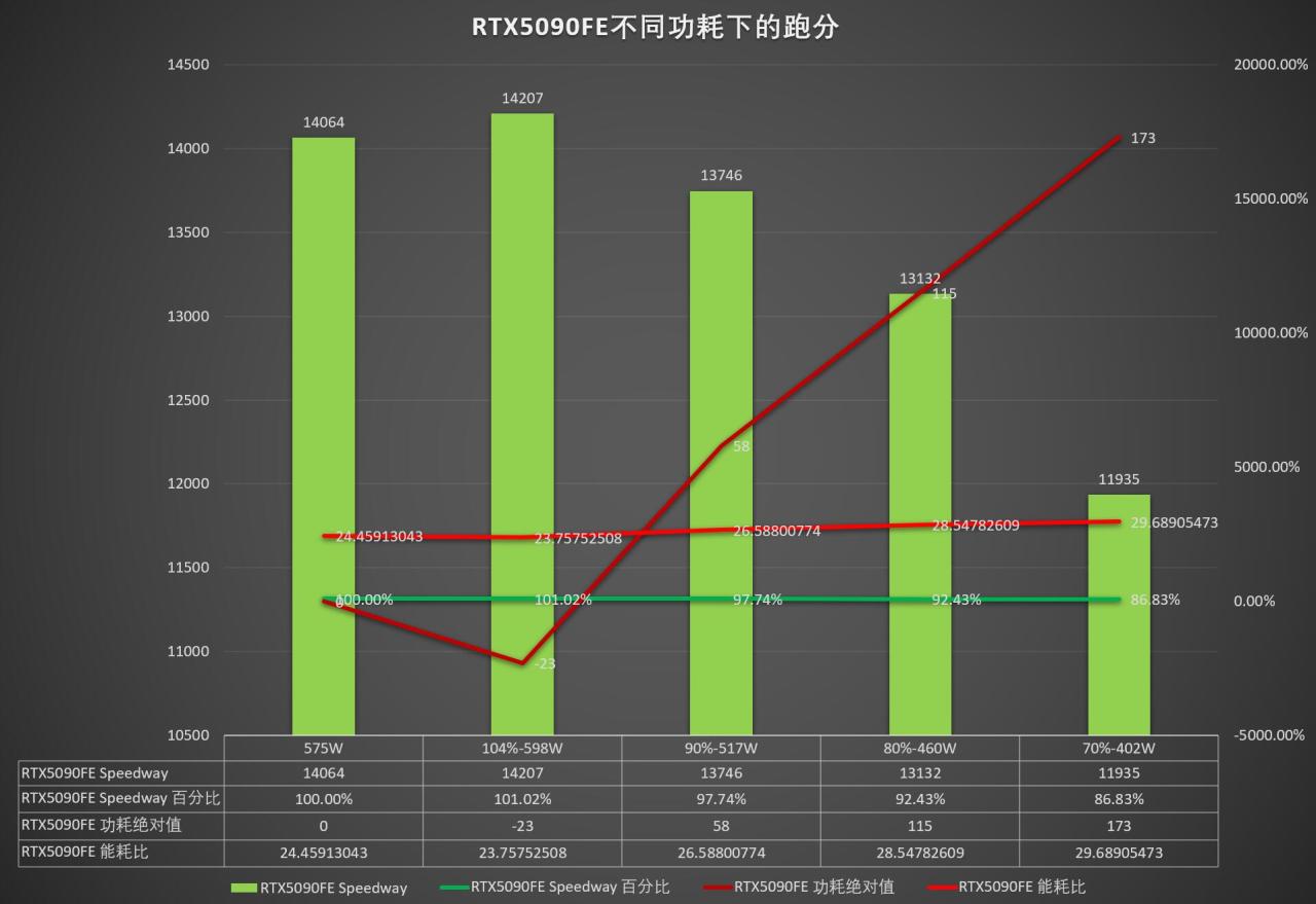 跑了一下104-70%不同功耗比例下的FE,能耗比当然是功耗越低越强,70%功耗下性能依然比4090FE强,但是领先幅度就只有20%了,和4090FE相近功耗的80%状态下比4090强30%多,这个就非常合适了,更高状态以及默认下再怼出来150W近30%的功耗只能换来10%提升,完全不划算: