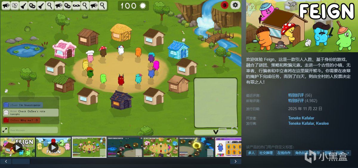 欢迎体验 Feign,这是一款引人入胜、基于身份的游戏,融合了谜团、策略和欺骗元素。走进一个古怪的小镇,无辜者、行骗者和中立者将在这里展开智斗。你需要在夜幕的掩护下完成任务,而到了白天,则由全村的人投票决定有罪之人!