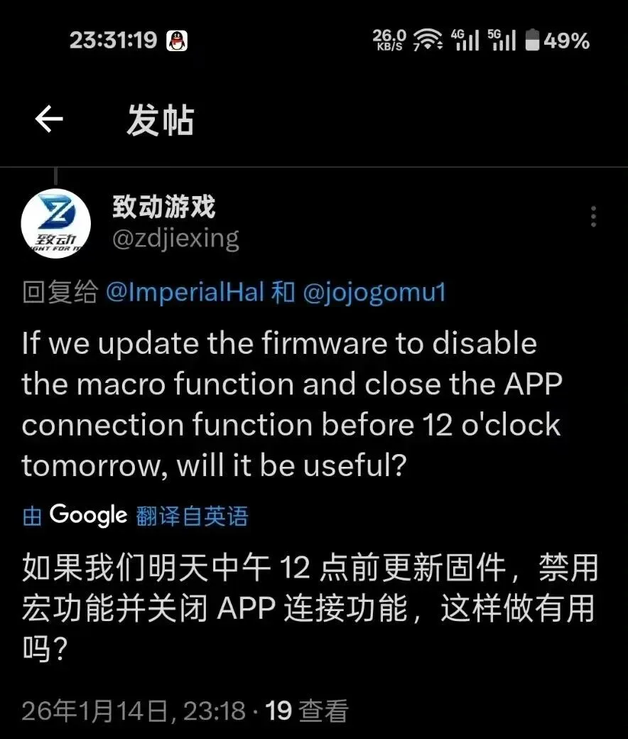 由于Hal选手使用的是国产品牌“致动”手柄,于是致动品牌半夜发帖询问,如果赶在第二天中午前更新固件,禁用宏功能和关闭app连接功能是否可行。