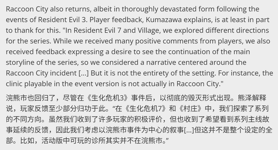 他指出,这并不代表场景的全部:“例如,活动版本中可游玩的诊所实际上并不位于浣熊市内。”根据此前预告片的暗示,维克多·吉迪恩似乎正藏身于此,等待里昂等人的到来。