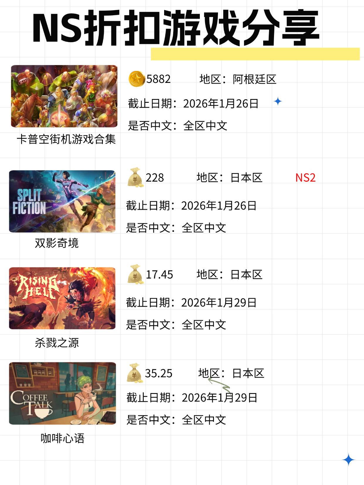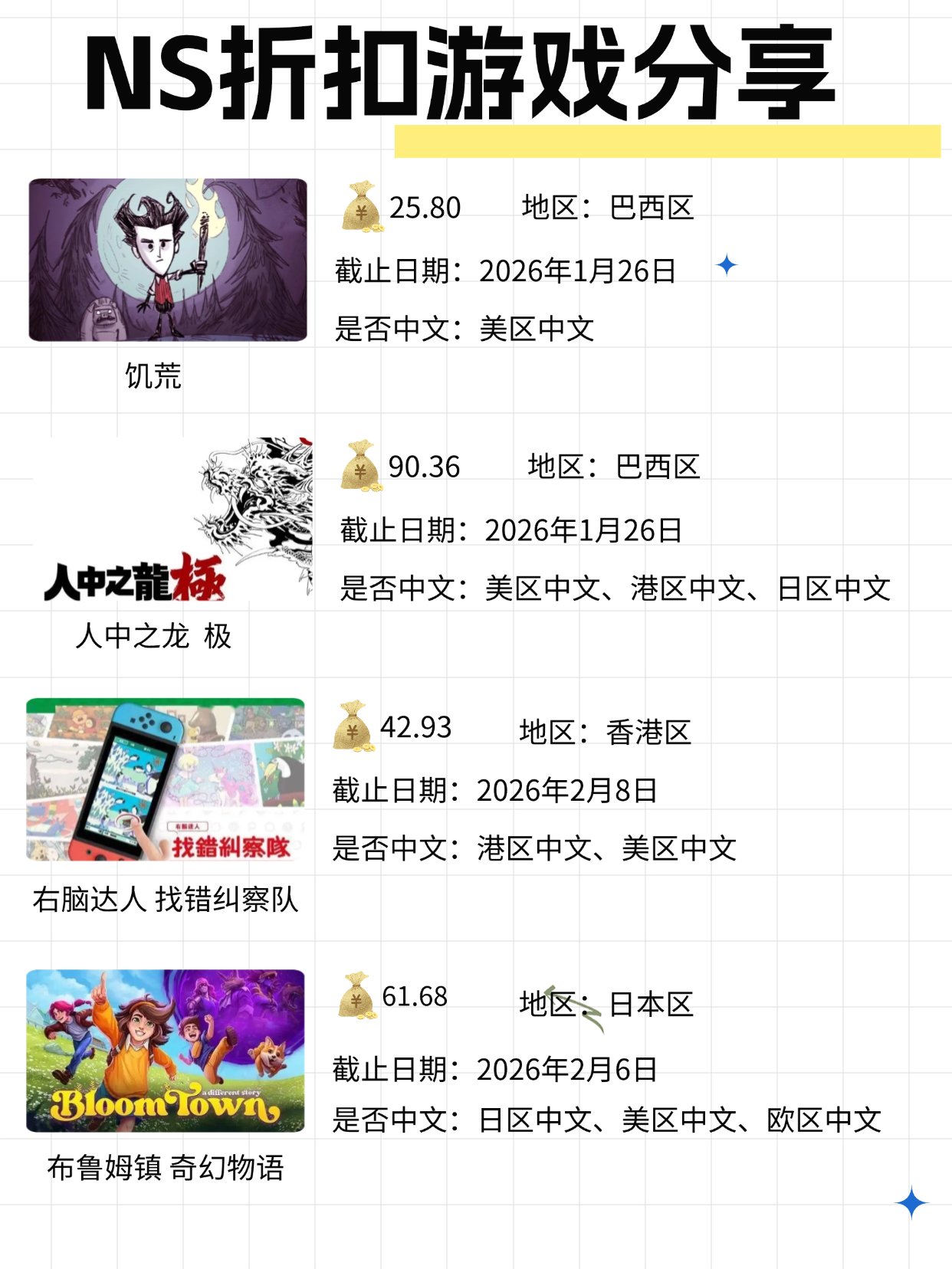 本周饥荒和饥荒联机版进入了巴西折扣区,阿根廷区我依旧选取了可以兑换,还算是有一丢丢性价比的游戏,个人比较喜欢的游戏像素风的咖啡心语也比较不错,喜欢像素慢节奏的玩家可以一试,另外人中之龙极在巴西区再次迎来史低,已经将至两位数,可以入了!