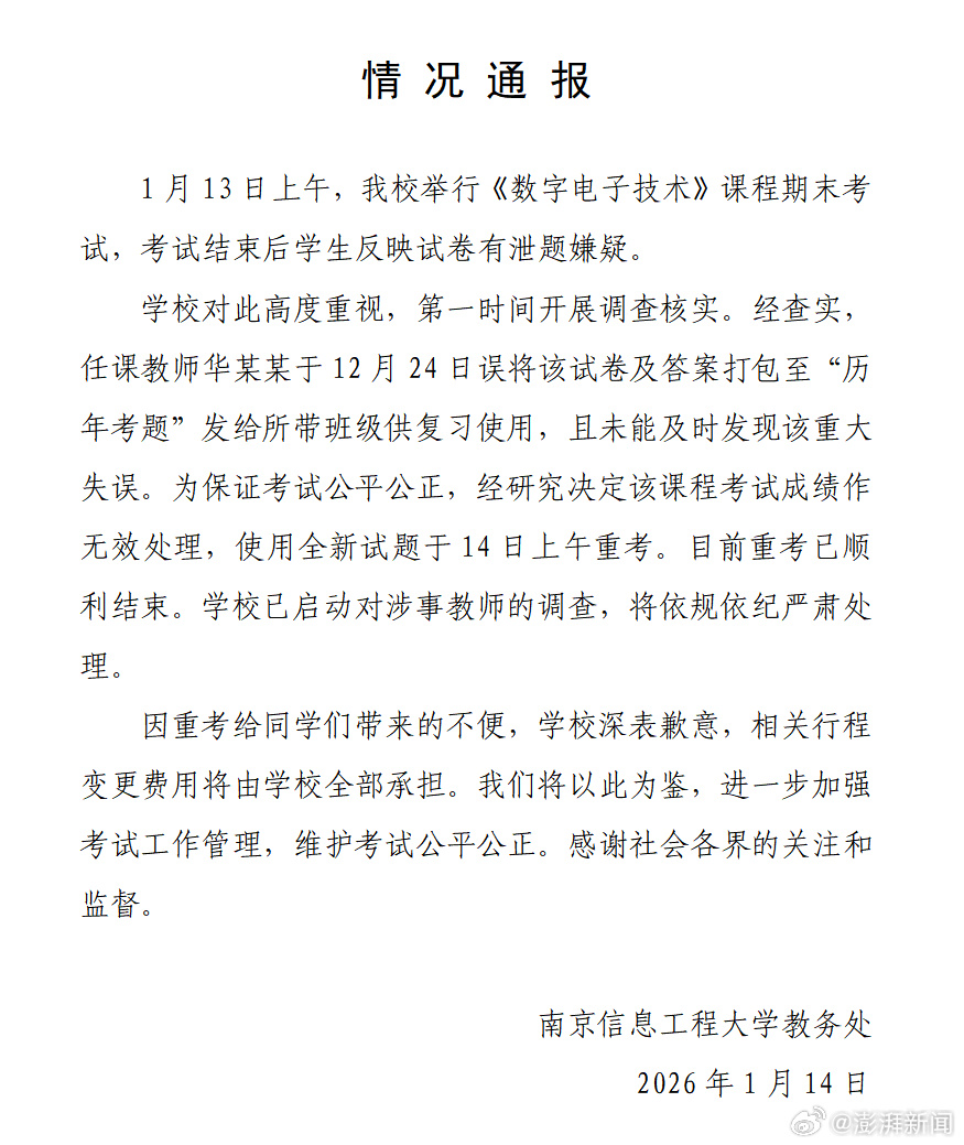 1月14日,南京信息工程大学教务处正式发布《情况通报》,针对此前学生反映的《数字电子技术》课程期末考试泄题一事做出回应。校方确认事件系任课教师操作失误导致,目前该科目考试成绩已被认定无效,全员重考工作已于今日(14日)上午顺利完成。 据通报披露,事件的起因是一场匪夷所思的“乌龙”。