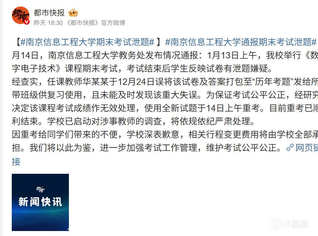 为维护学术公平,南京信息工程大学在核实情况后迅速决定将1月13日的考试成绩作废,并紧急启用了备用试卷,于次日(14日)上午组织了重考。考虑到部分学生可能已安排了离校行程,学校承诺将全额承担因重考导致的行程变更费用。目前,学校已启动对涉事教师华某某的纪律调查程序,表示将依规严肃处理。