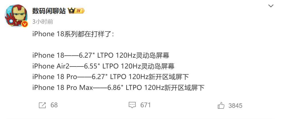 苹果iPhone17系列大获成功,带动2025年苹果市场份额实现增长,成功拿下全球第一。国内市场,截至2026年W1,iPhone17系列总激活量已超1600万台,对比iPhone16系列实现大幅增长。按照惯例,iPhone18系列将于今年9月发布,近日,博主“数码闲聊站”爆出苹果18已经打样,屏幕尺寸维持不变,但Pro和ProMax有望采用屏下摄像头和3D人脸。