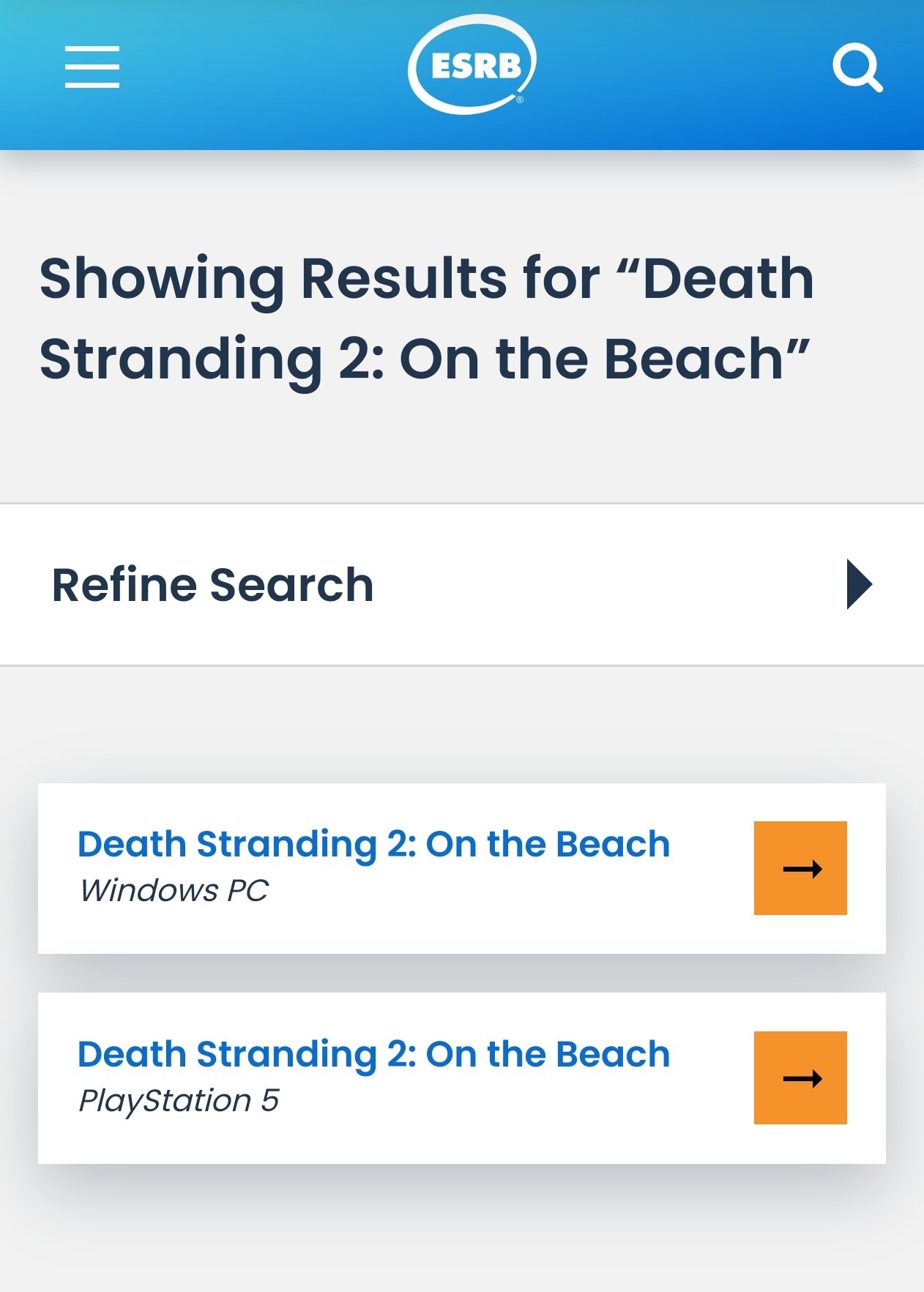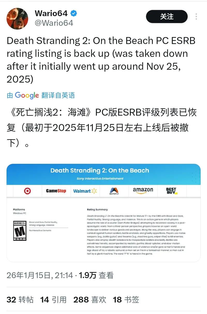 知名游戏爆料者Wario64于2026年1月15日发布消息称,《死亡搁浅2:冥滩之上》PC版的ESRB评级列表已重新上线。该评级最初在2025年11月25日左右公布后曾被撤下,此次恢复也让玩家对这款游戏的PC版上线进度多了一份期待。