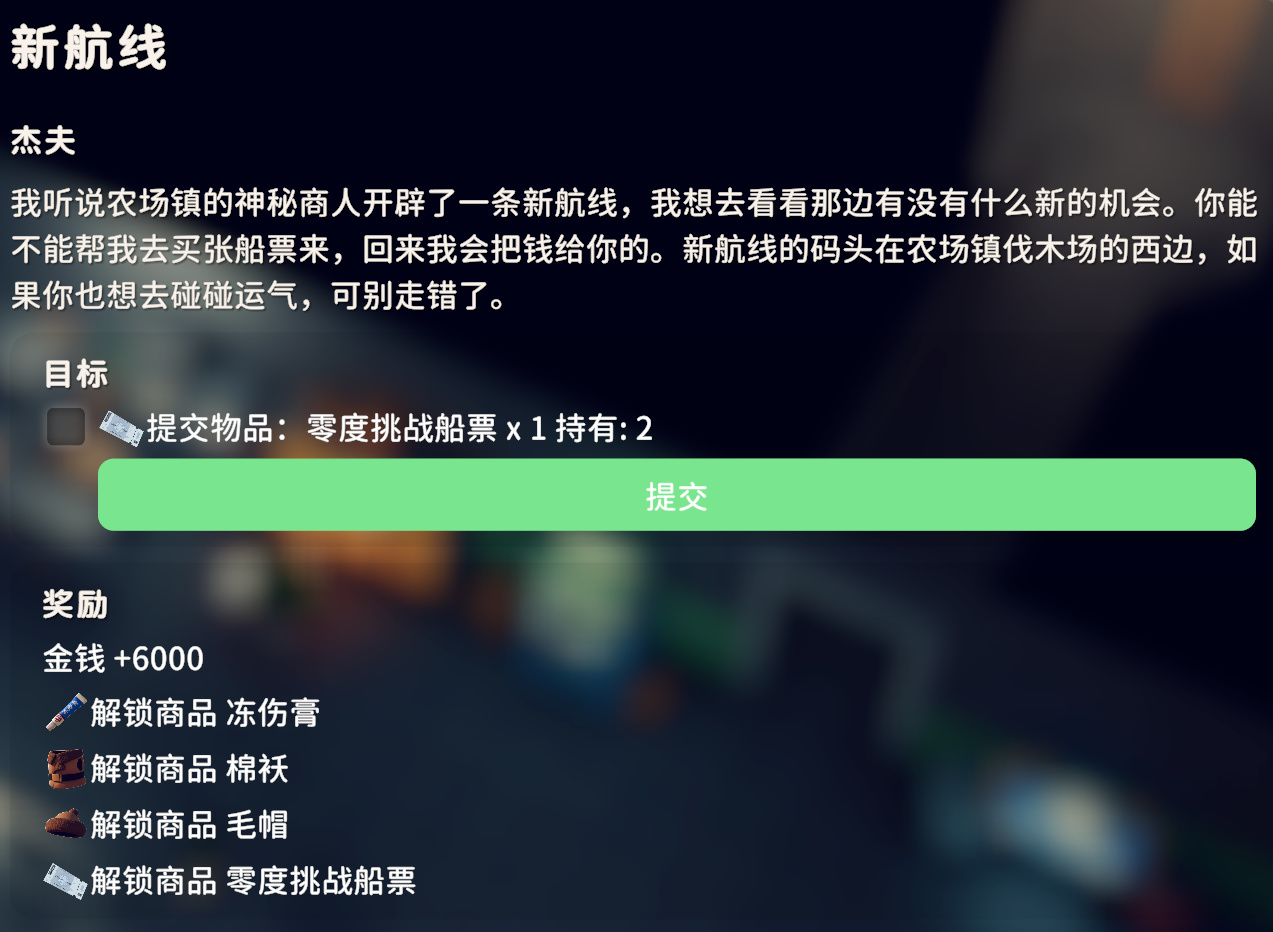 使用船票的位置有两个,可以直接在农场镇伐木场那里找到一个小船,或者是在家里下水道使用。个人建议第一次还是买了票直接回家,回去把任务交了,解锁应对地图冰冻debuff的专属道具之后再去挑战。