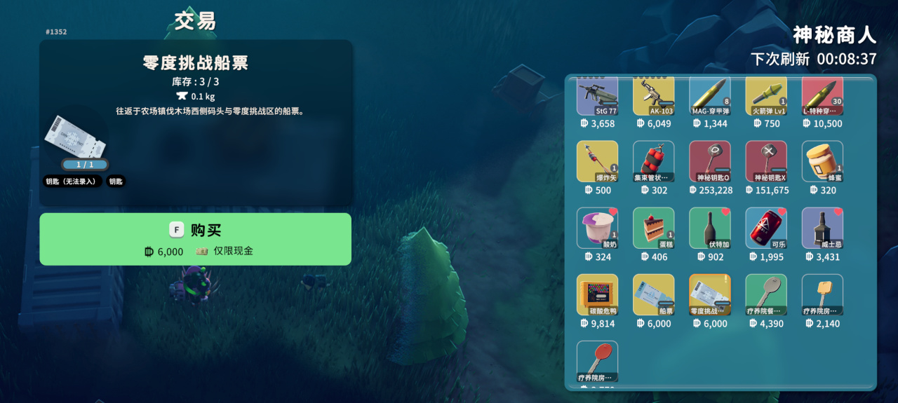 零度挑战船票主要还是靠商店购买,购买地点在农场镇的神秘商人处,一张售价6000,一次可以买三张。这里小二还是给新手玩家提个醒,记得带上现金,或者干脆到农场镇搜刮一圈之后,再过来卖一点收集品。