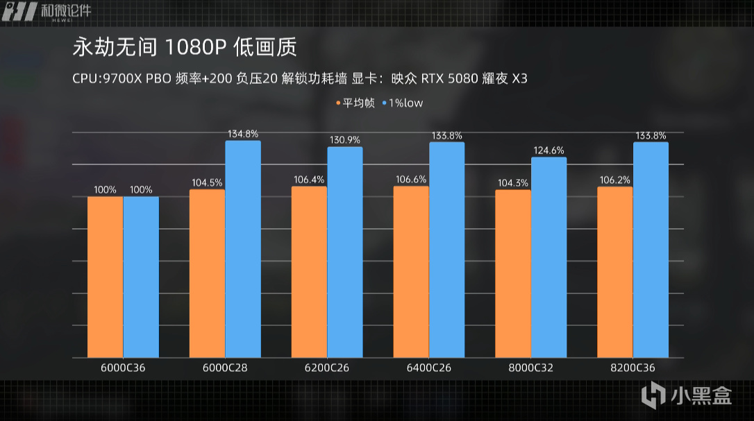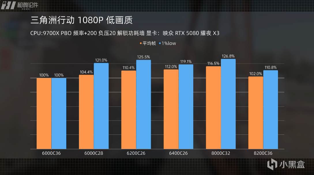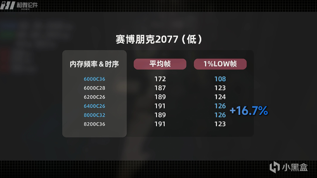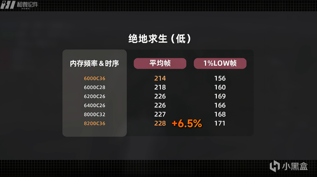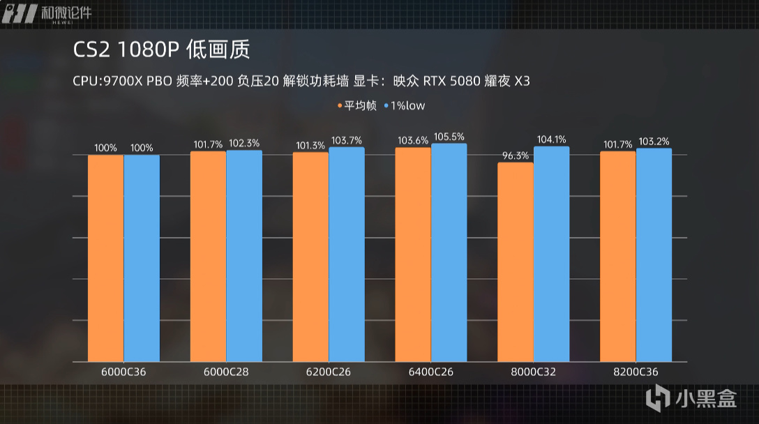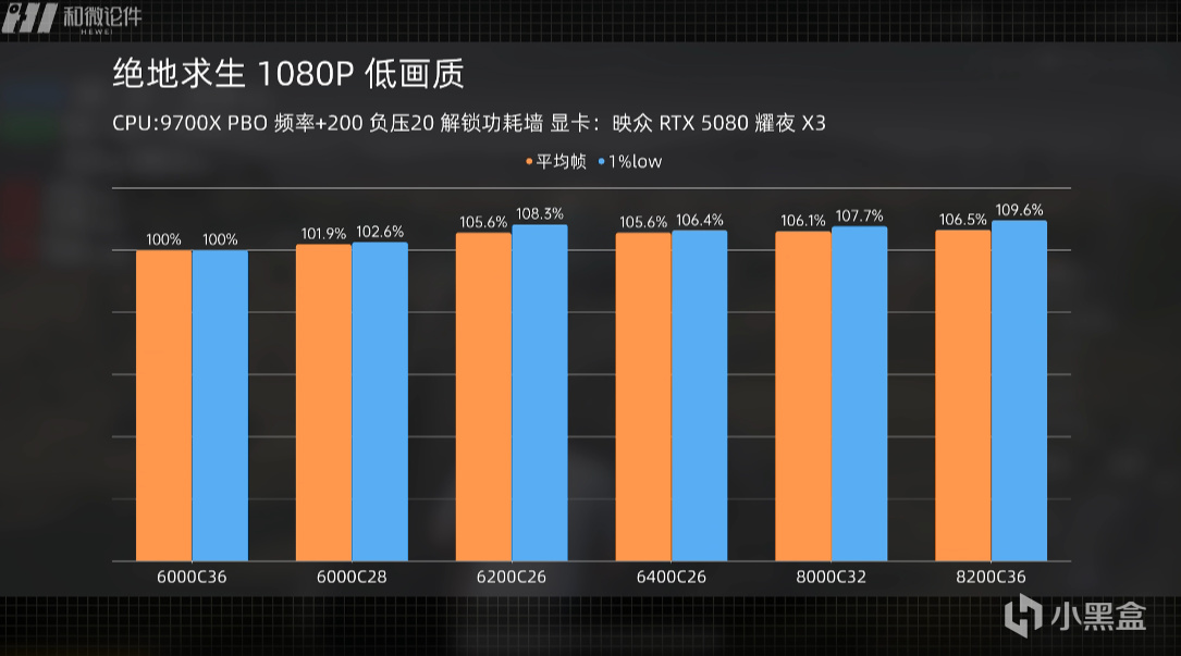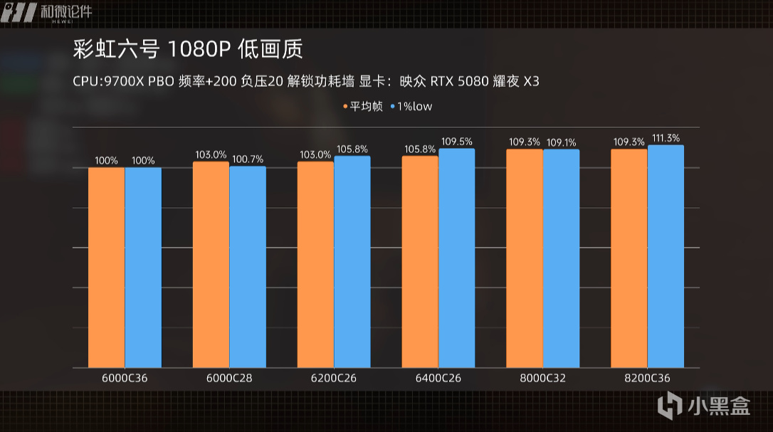 1%low上,6000C28为102.3%,6200C26为103.7%,6400C26为105.5%,8000C32为104.1%,8200C36为103.2%。