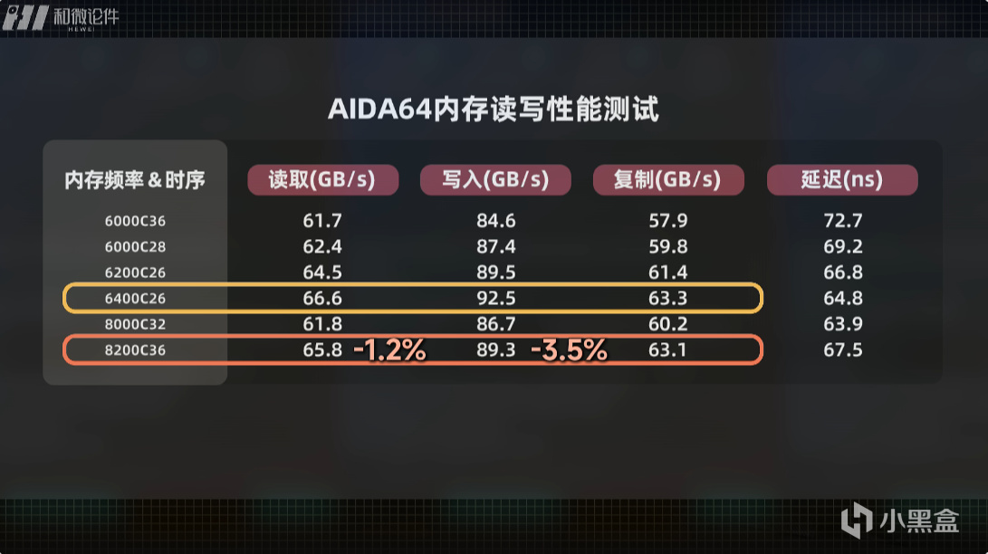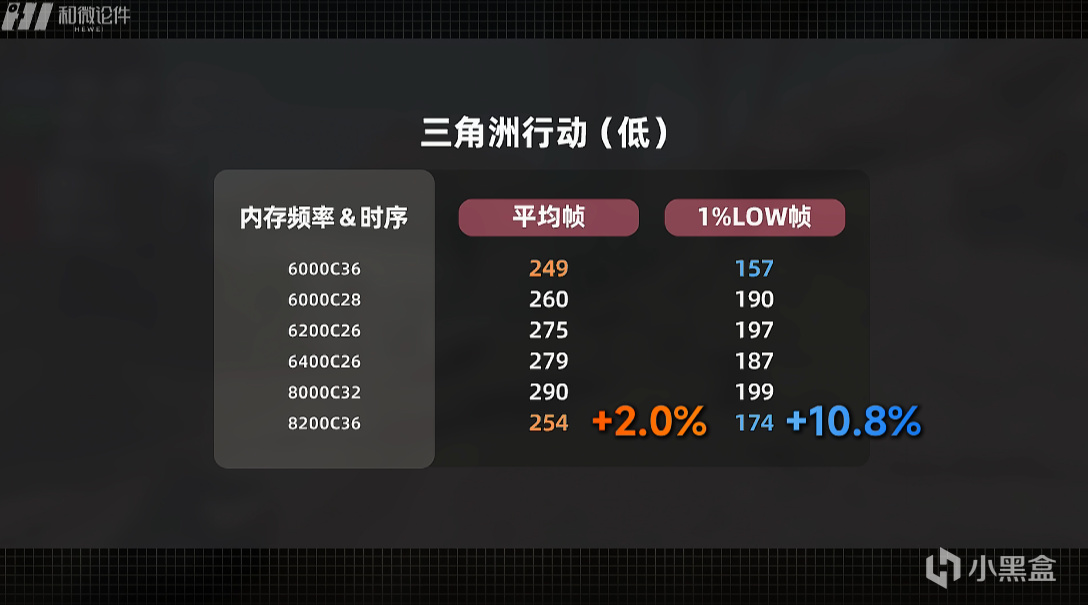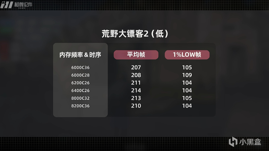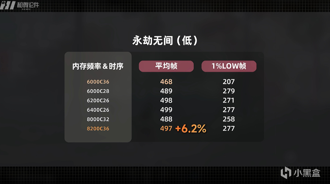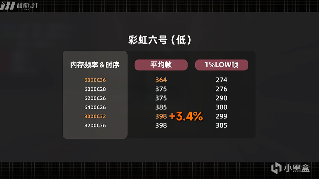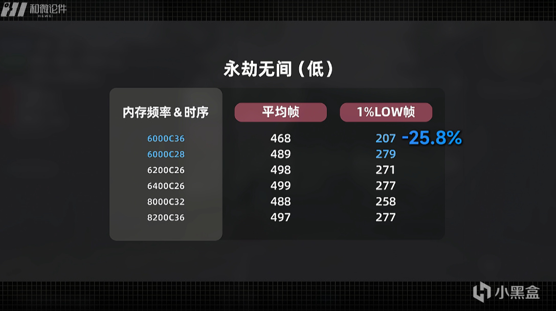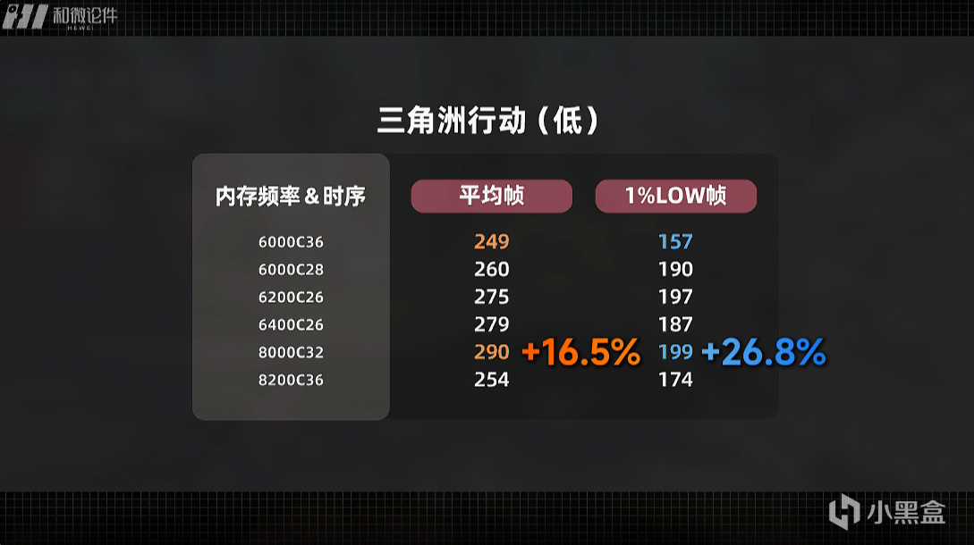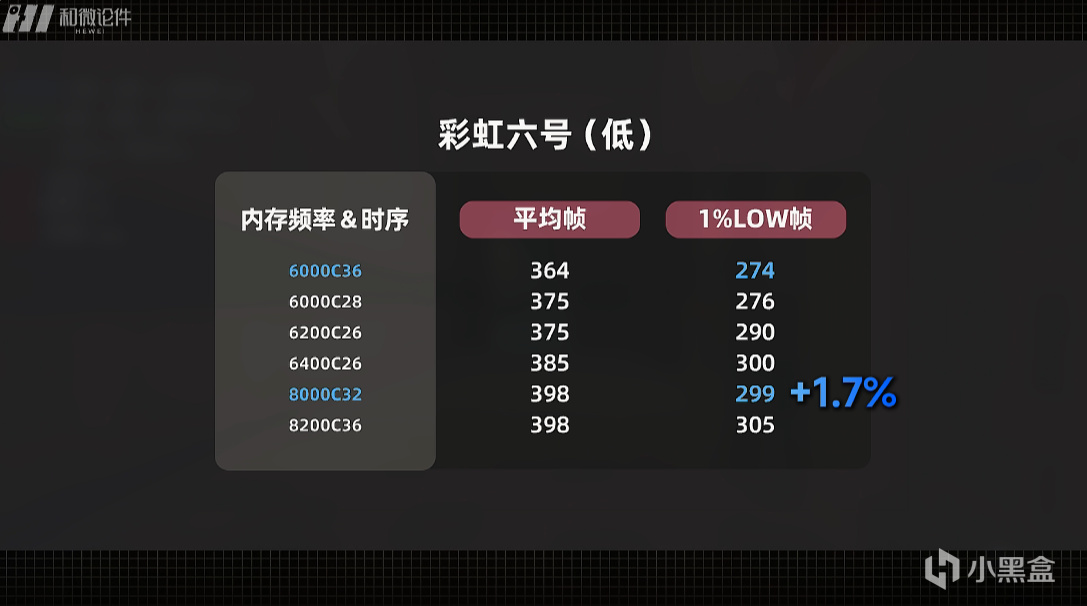 1%low上,6000C28为102.3%,6200C26为103.7%,6400C26为105.5%,8000C32为104.1%,8200C36为103.2%。