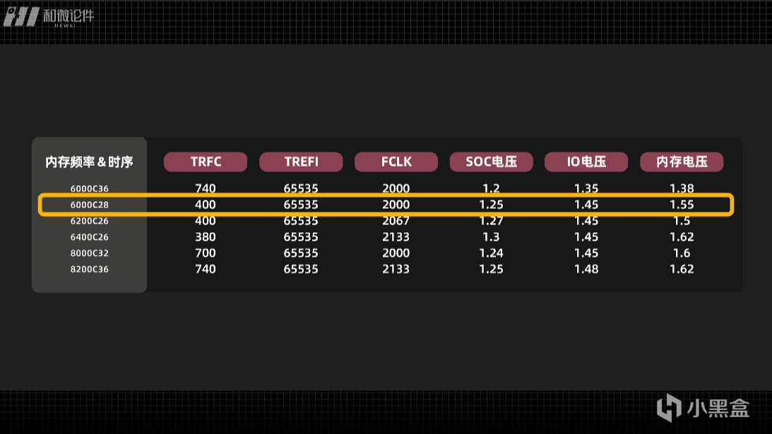 6000C28由海力士A-DIE的威刚龙耀D500G 6000C28开启EXPO,手动紧参至TRFC 400,TREFI 65535,FCLK 2000,此时SOC电压为1.25,IO电压为1.45,内存电压为1.55。这一套参数适合超频新手,颗粒要求为海力士Adie、3Gmdie或者体质较好的2Gmdie。不算很紧,难度基本相当于DDR4的3600 C16再压一下小参。