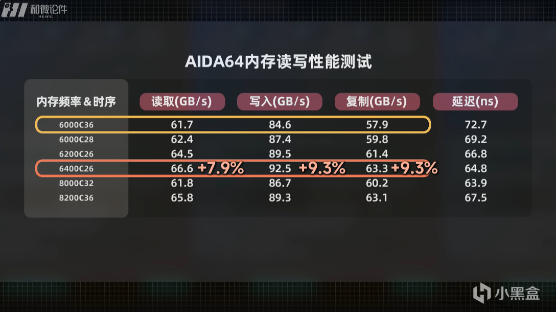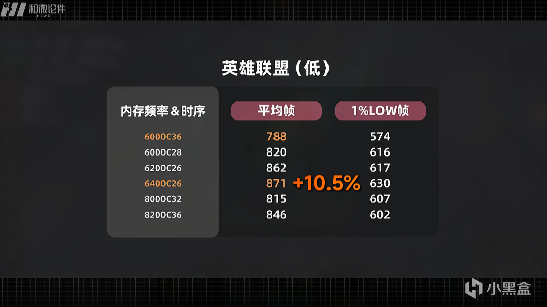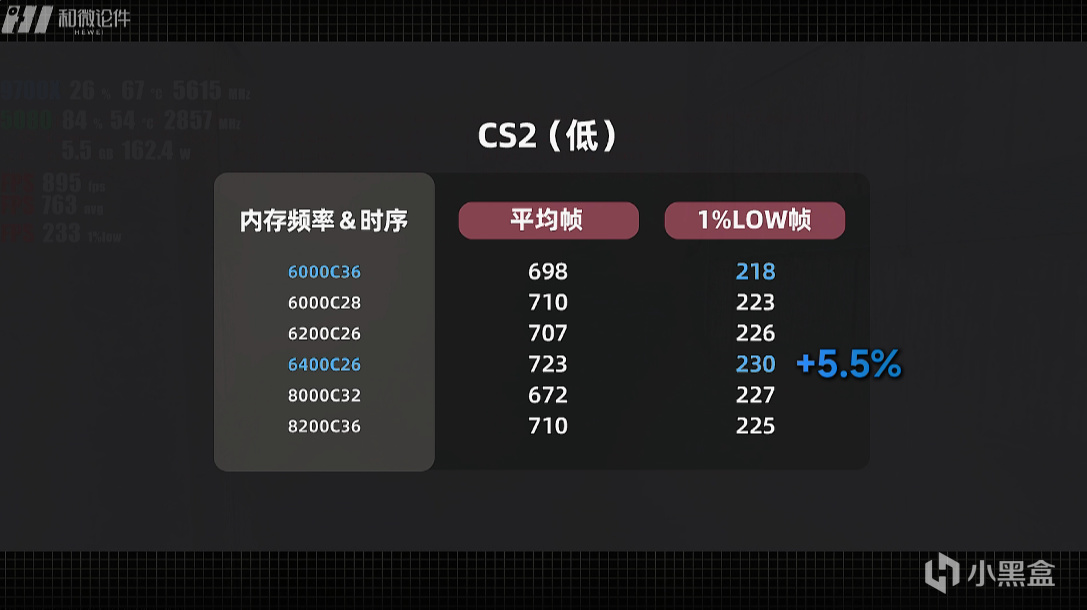 6400C26帧数最高,平均帧较最低的6000C36高约10.5%,1%low高约9.8%;平均帧领先8200C36约3.0%,1%low高约4.7%。