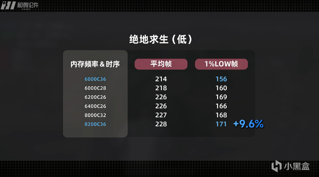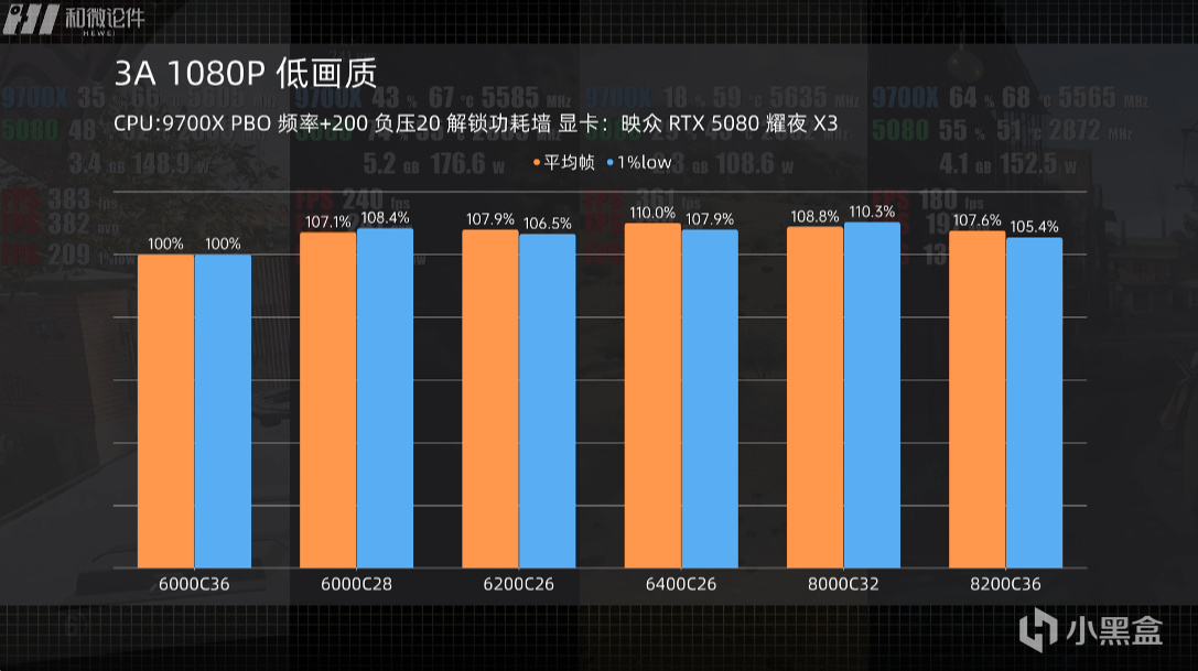 1%low上,6000C28为102.6%,6200C26为108.3%,6400C26为106.4%,8000C32为107.7%,8200C36为109.6%。