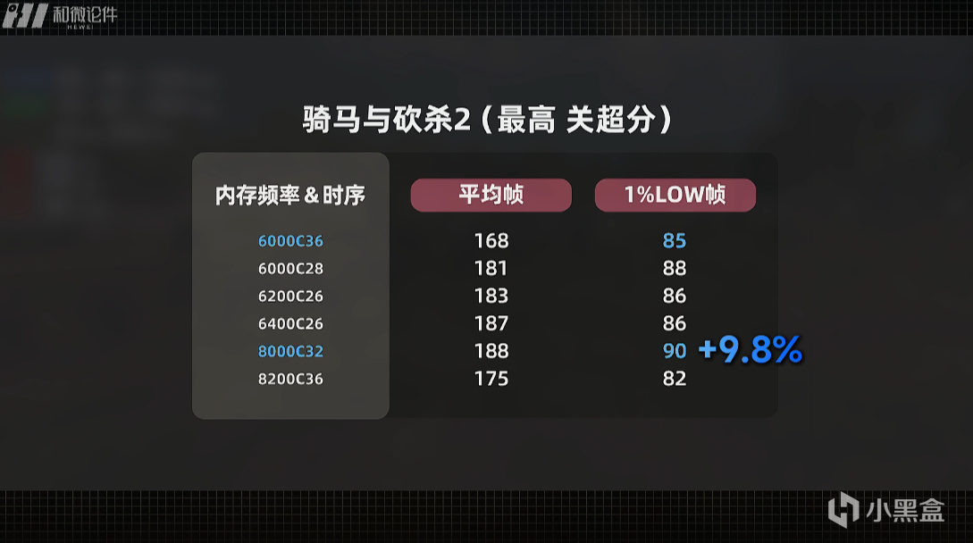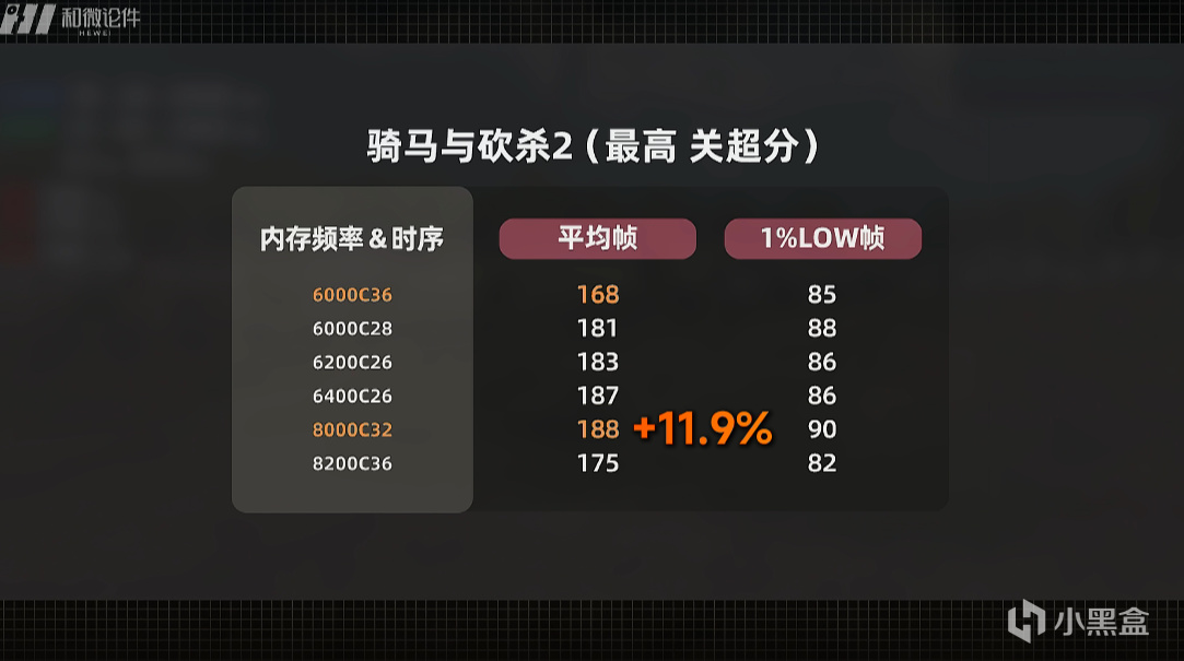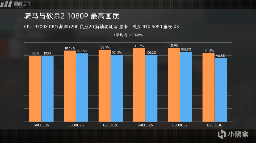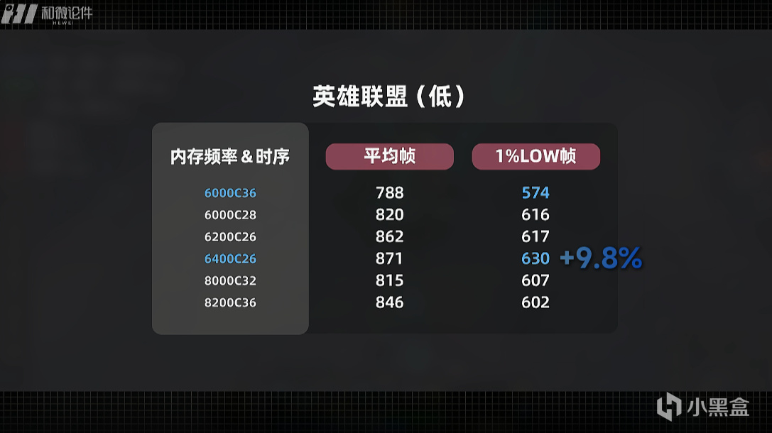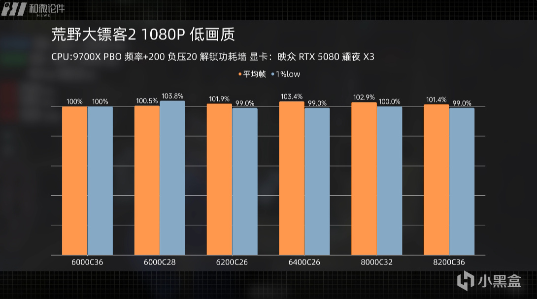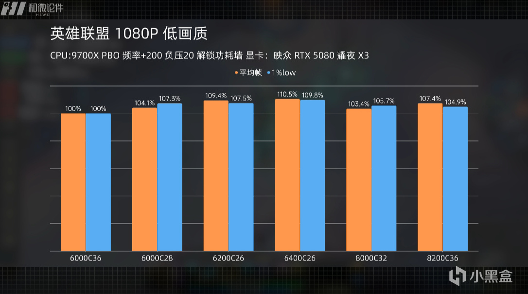 平均帧上,6000C28和6200C26同为103.0%,,6400C26为105.8%,8000C32和8200C36同为109.3%。