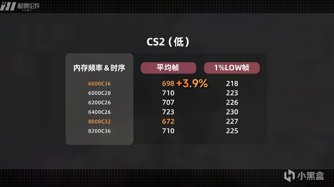 先看竞技类网游CS2,跑创意工坊BENCHMARK,以6000C36为百分比基准参数。