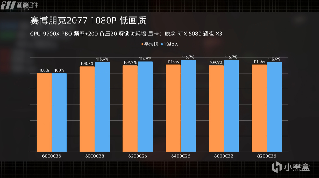 平均帧上,6000C28为108.7%,6200C26和8000C32同为109.9%,6400C26和8200C36同为111.0%。