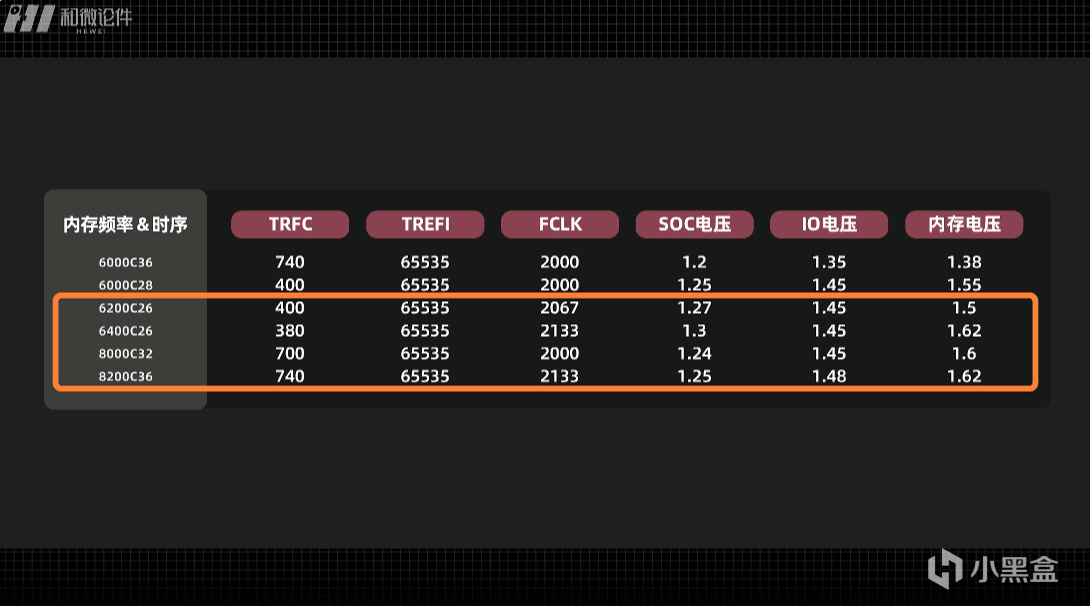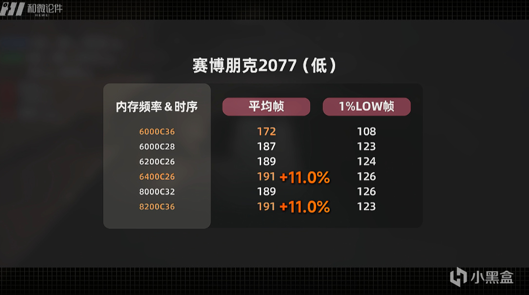 1%low上,6000C28为100.7%,6200C26为105.8%,6400C26为109.5%,8000C32为109.1%,8200C36为111.3%。