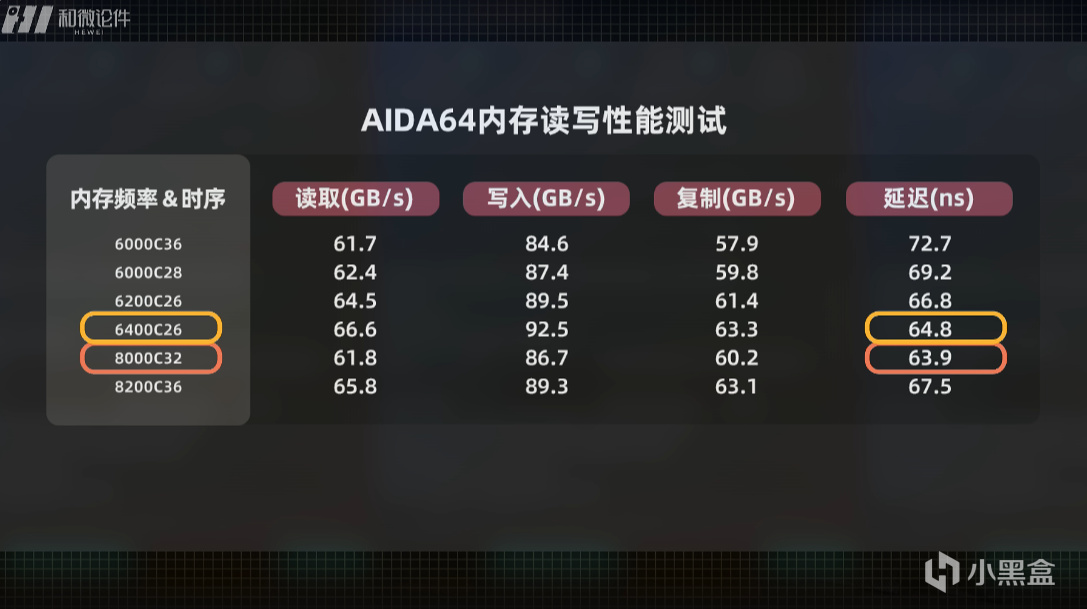 延迟最低的是8000C32 63.9NS,最高的是6000C36的72.7NS,相差8.8NS;6400C26延迟较8000C32也仅高0.9NS。