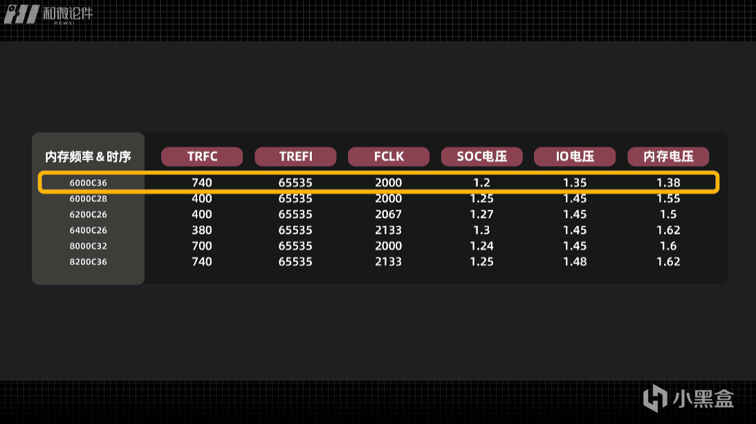 6000C36这一组由长鑫颗粒的金百达黑刃 6000C36开启EXPO来代表,再手动紧参至TRFC 740,TREFI 65535,FCLK 2000,此时SOC电压为1.2,IO电压为1.35,内存电压为1.38,这个频率和时序基本可以代表非海力士颗粒的常规表现,美光、南亚这些颗粒也能达成,放到DDR4里面类比的话,基本相当于3200C16的内存稍微压一下时序;