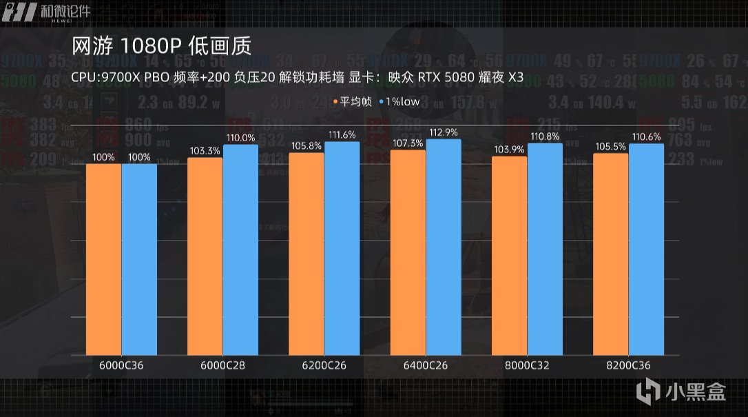 平均帧上,6000C28为101.9%,6200C26和6400C26同为105.6%,8000C32为106.1%,8200C36为106.5%。