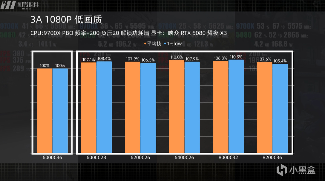 1%low上,6000C28为107.3%,6200C26为107.5%,6400C26为109.8%,8000C32为105.7%,8200C36为104.9%。