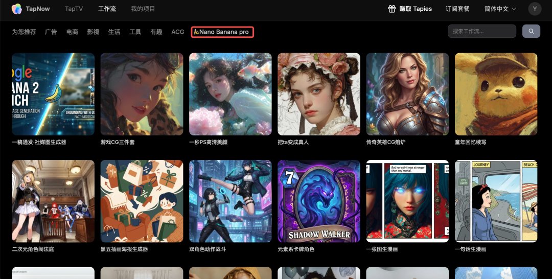 对于新手来说,学习 AI 视频,我这里真心推荐 Tapnow,刚入门,上面有⼗余种不同玩法的 Nano Banana Pro ⼯作流。还可以自制工作流,上传到官方也一样可以获得大额积分,真给哄成胎盘了。