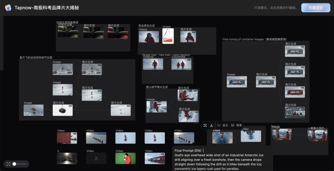 不知道你有没有看到,右上角还有一个“克隆项目”按钮,告别繁琐的节点连接和报错修复。在 Tapnow,所有⼯作流均为“开箱即⽤”状态,点击“克隆”即可直接运⾏。