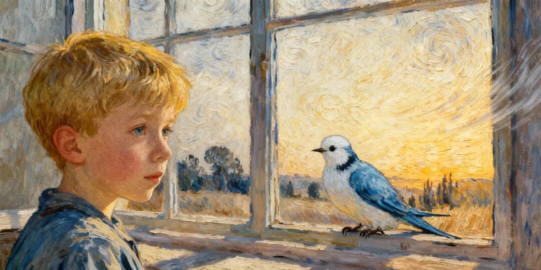 故事的画风应该是偏油画风格,主要讲了一个男孩,清晨在饭桌旁边吃着早饭,忽然看到窗边有一只奇特的鸟儿,鸟儿有着白色的腹部,蓝色而光滑的羽毛。