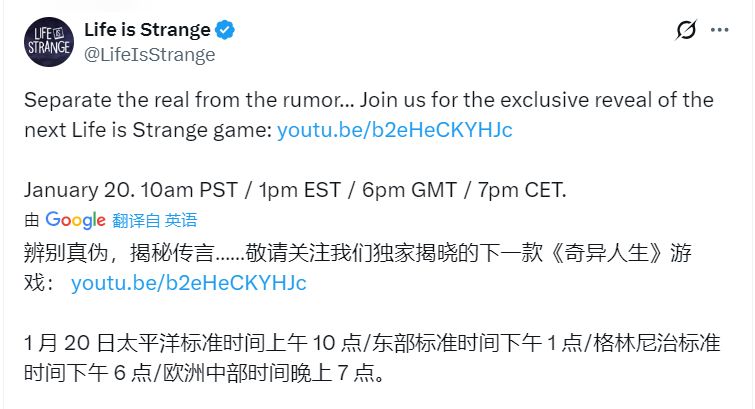 《奇异人生》官方账号宣布:系列新作将于2026年发售!
