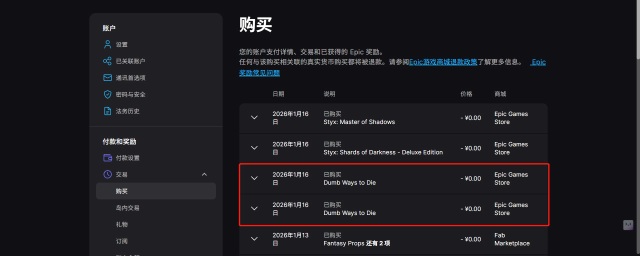 4.若不放心是否领取成功可以进入E宝账户的“交易”页查看:Epic购买记录页
