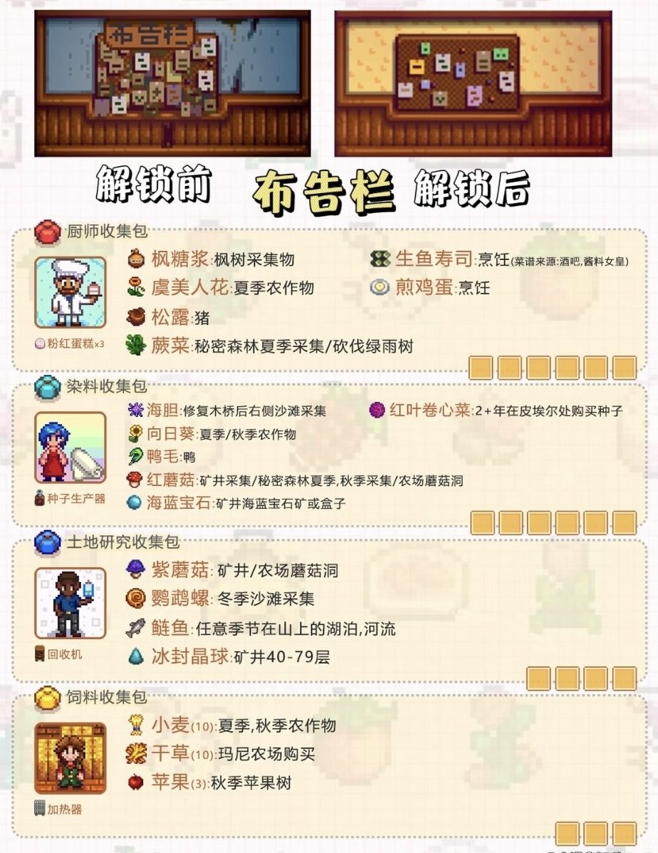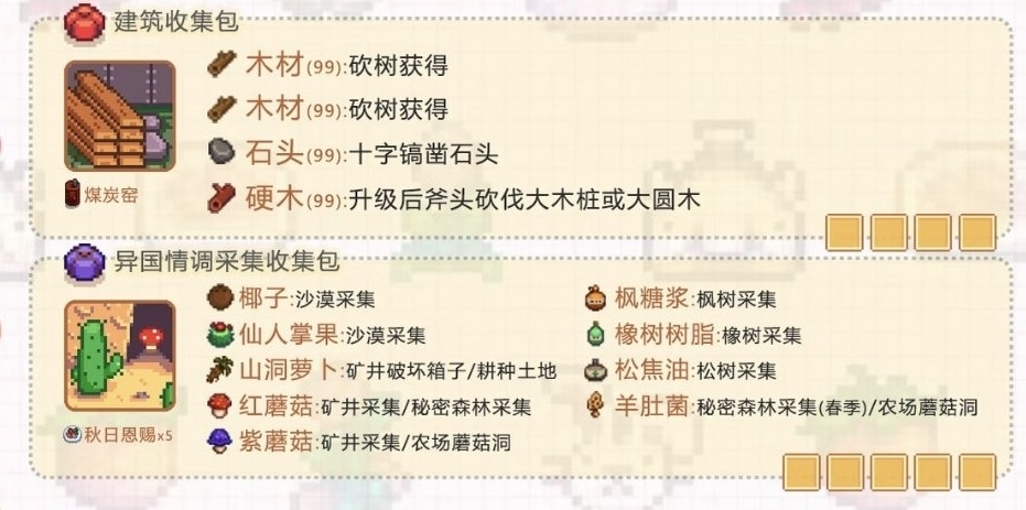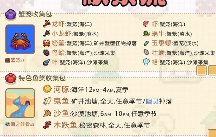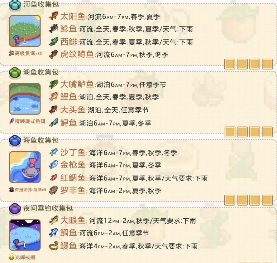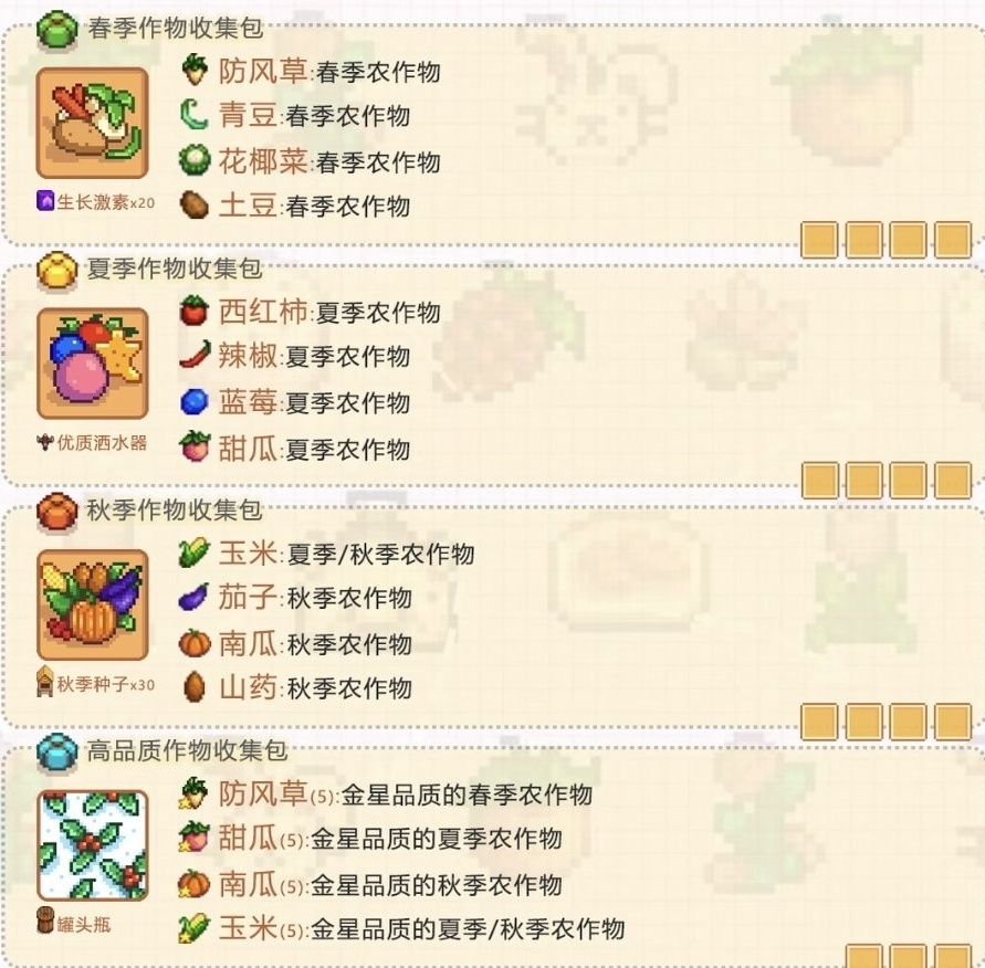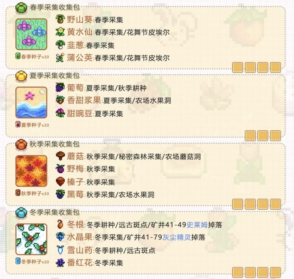(需要持续投入时间管理季节性物品收集,部分物品,仅在特定季节或条件下出现,容易错过,要求玩家规划种植、钓鱼或采矿)