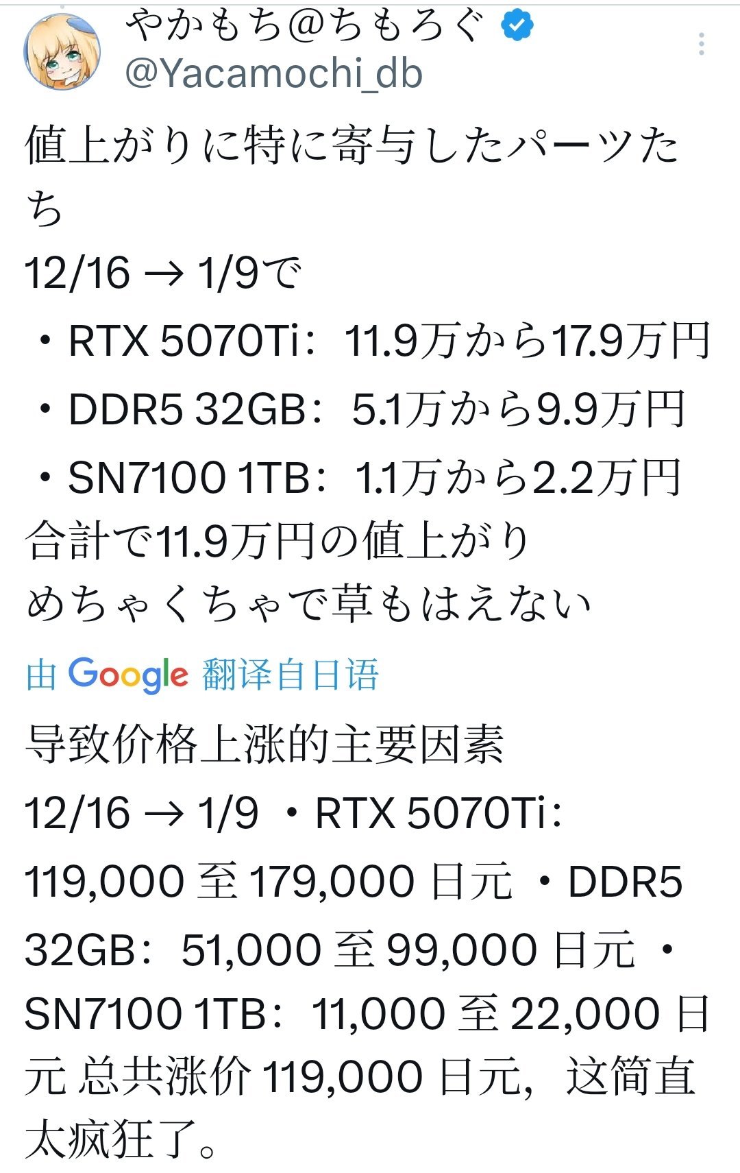 RTX 5070 Ti GPU:从约11.9万日元涨至17.9万日元,涨幅50%。这主要是因为高容量VRAM供应紧张,NVIDIA等厂商已减少中端GPU产量,转向AI芯片。当前Tsukumo上,单张RTX 5070 Ti售价稳定在17.9万日元左右,但库存有限。