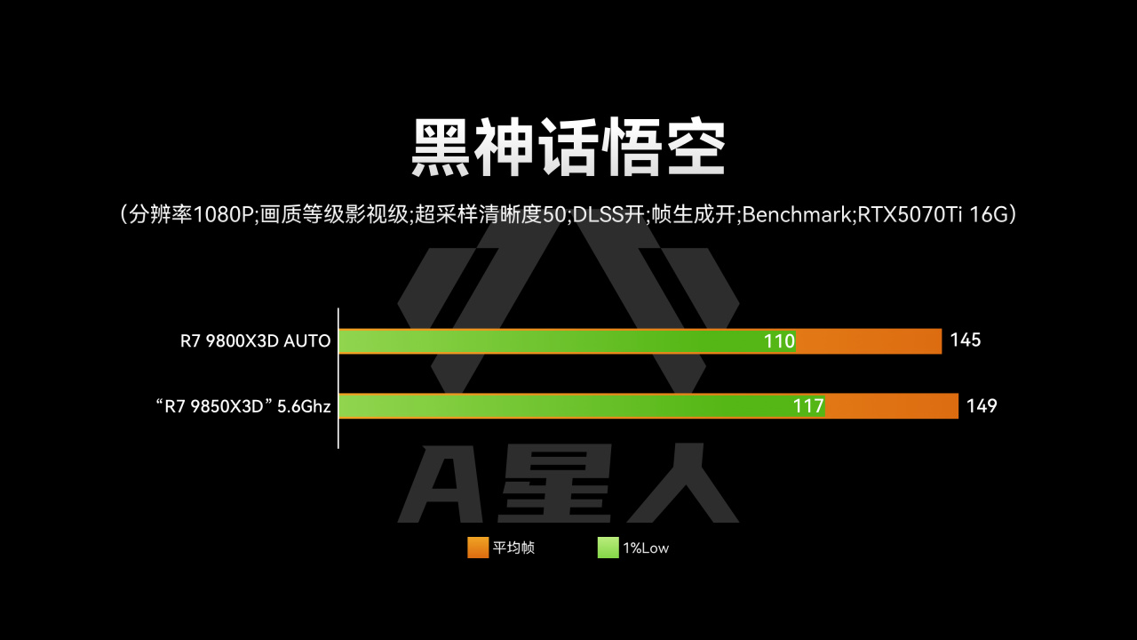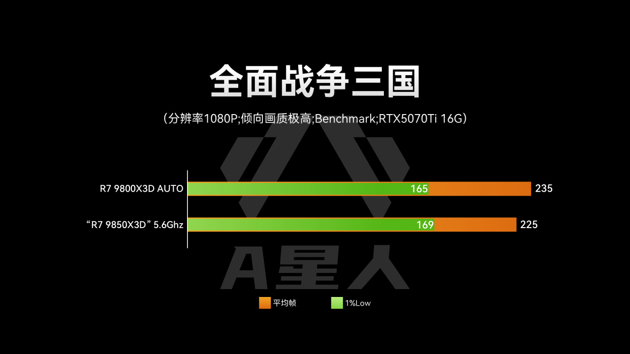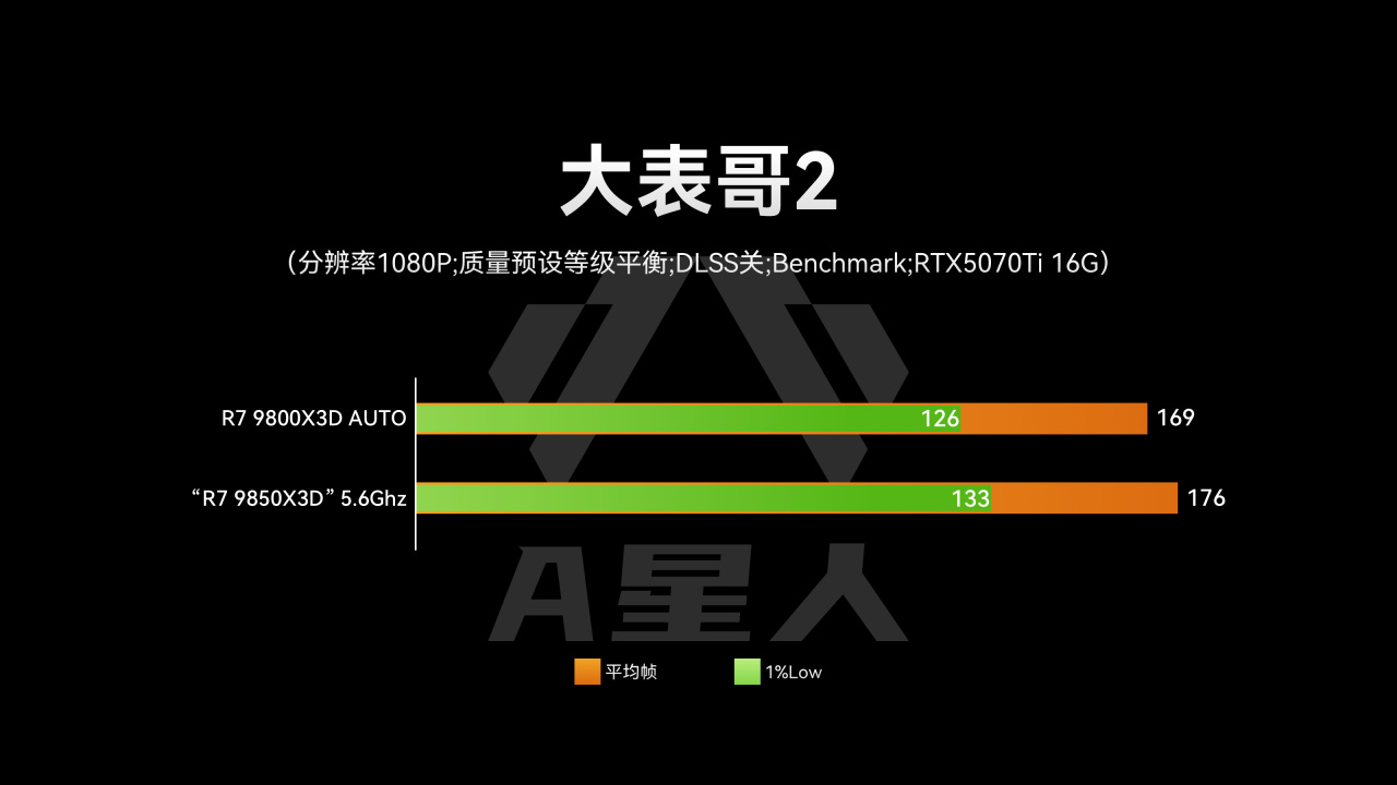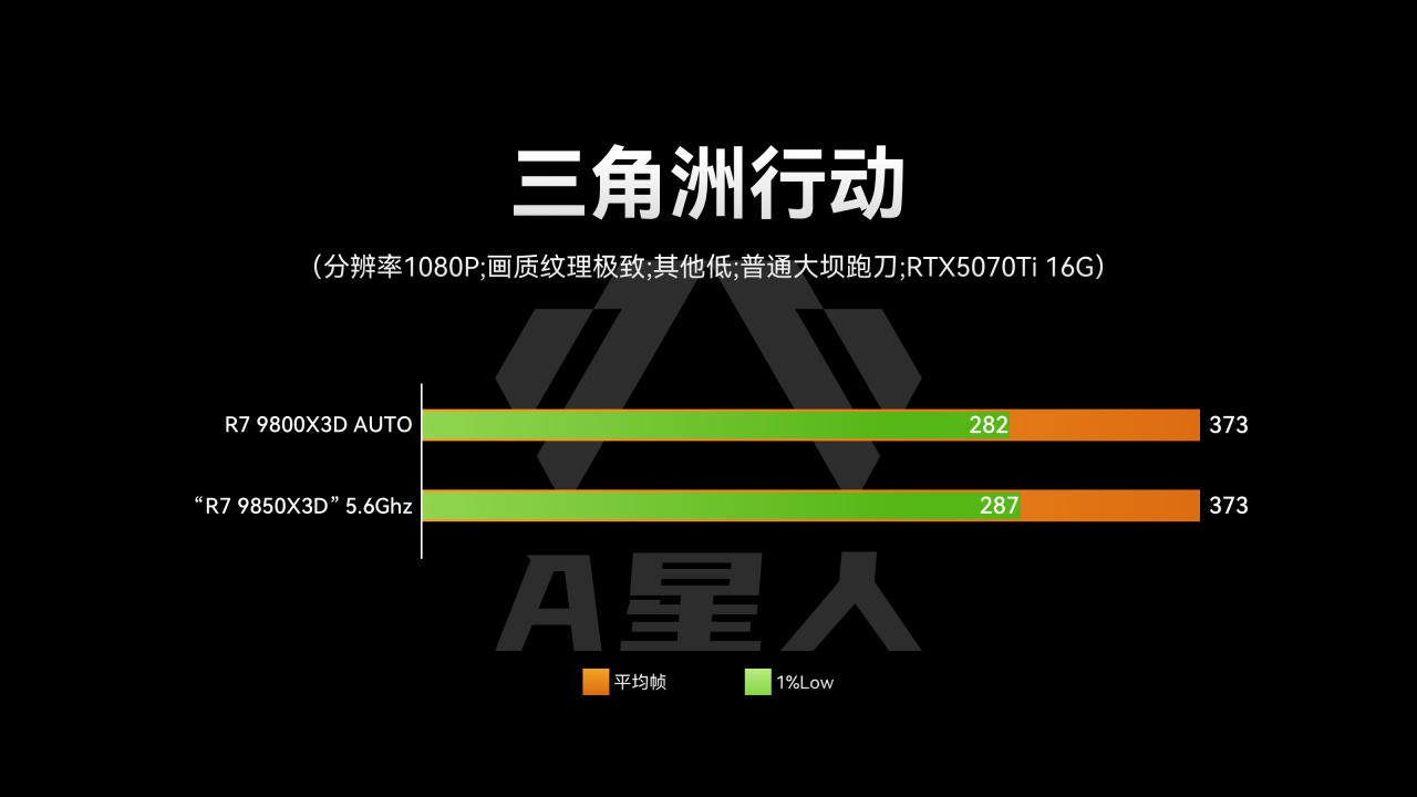 3A游戏除了全面战争三国和2077出现了开倒车的情况,其他几款基本上一模一样。在搭配5070TI显卡的情况下,“9850X3D”相比9800X3D,整体提升约3%到5%之间。