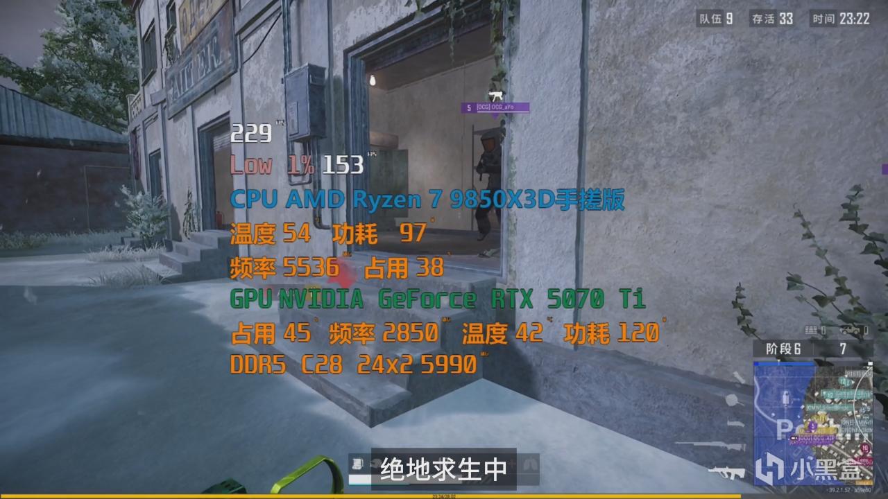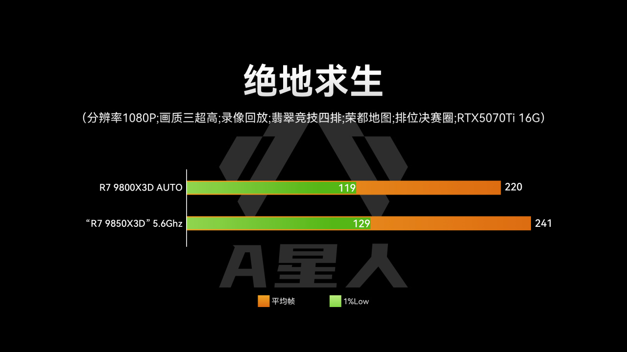 绝地求生中,“9850X3D”同样小幅度领先9800X3D,平均帧高了20 Low帧高了10,帧率更加稳定了。