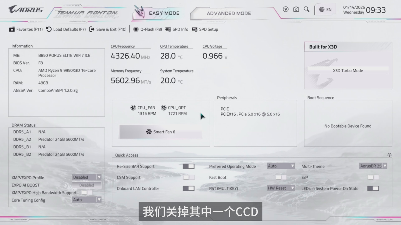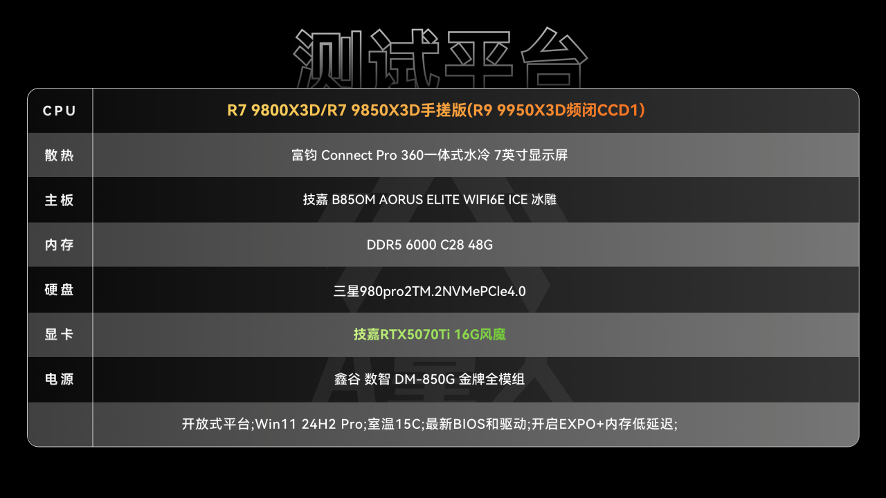 测试平台这边就简单过一下,直接就去到游戏测试,一起来看看这颗“9850X3D”对比9800X3D到底强多少。