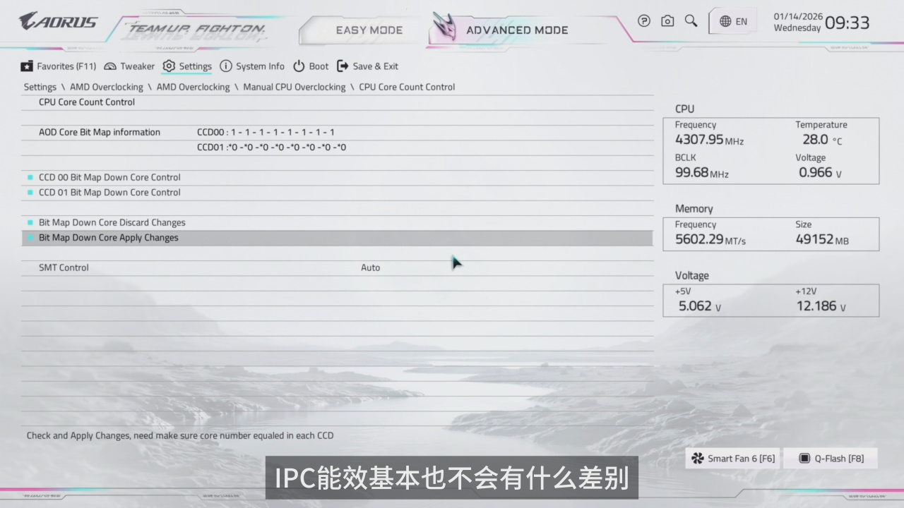 我们关掉其中一个CCD,缓存刚好降到96MB,由于9950X3D默认的加速频率就很高,所以这颗96MB三缓的CCD频率很容易就能到5.6GHz,纸面参数和9850X3D就基本保持一致,因为都是同架构 同工艺 同样的频率,IPC能效基本也不会有什么差别。