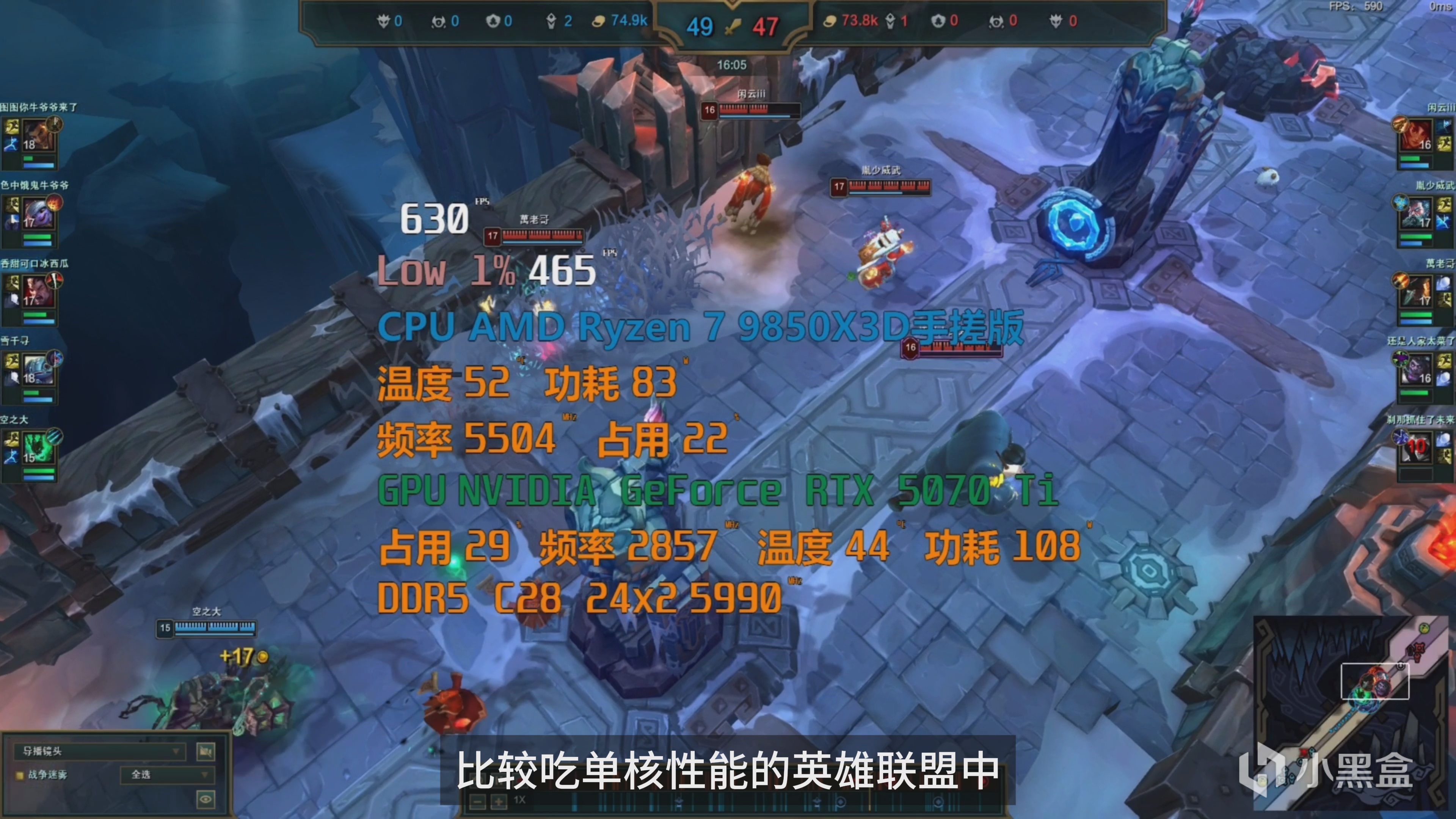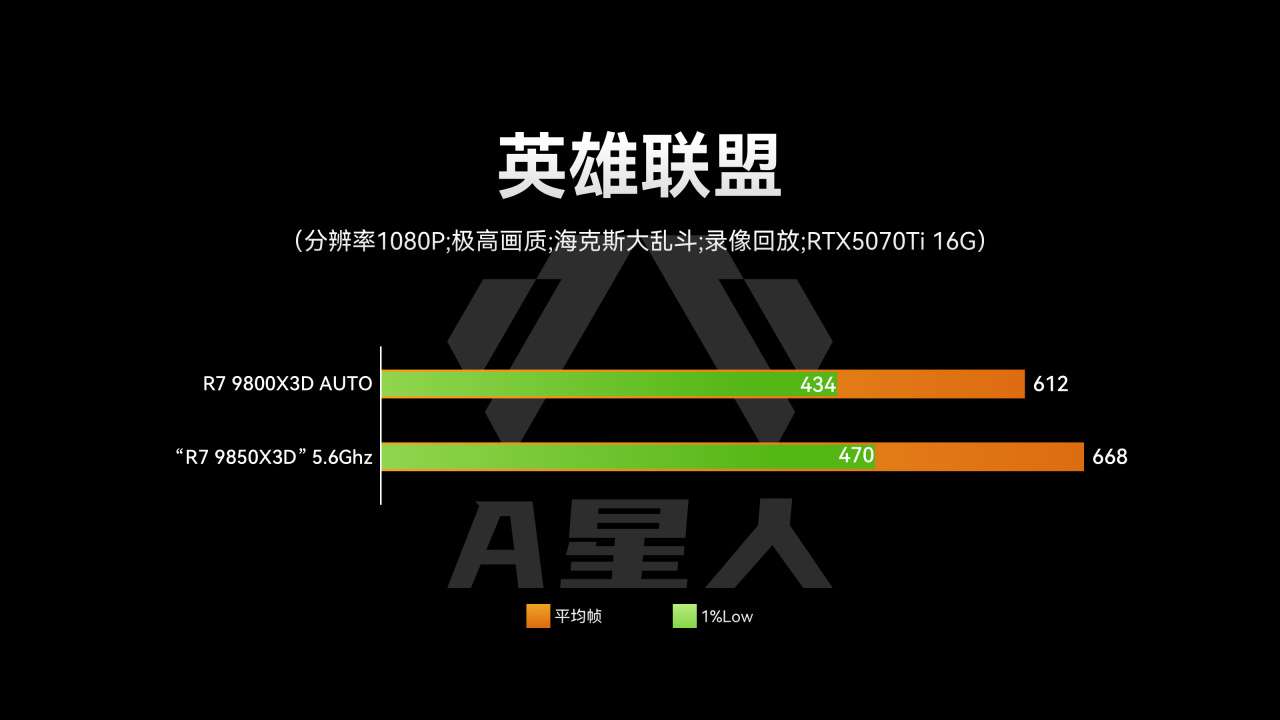比较吃单核性能的英雄联盟中,5.6Ghz的“9850X3D”帧率提升就非常明显了,高了10%左右。