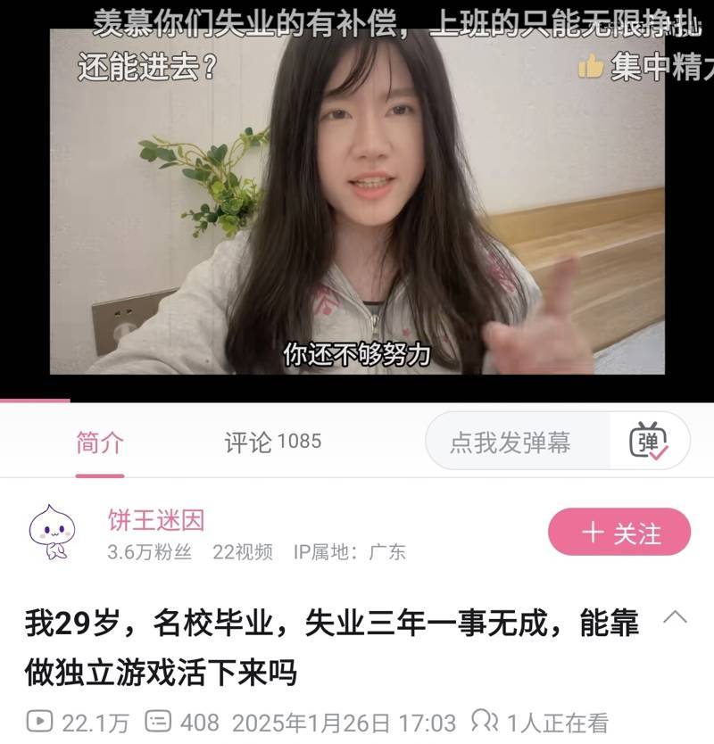 “我29岁,名校毕业,失业三年一事无成,能靠做独立游戏活下来吗”,这是B站UP主兼零经验游戏制作人“饼王迷因”,一年前在B站发布的一条视频。