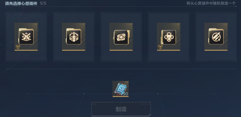 就比如你1、2、3、4、5插件都是想要的(你想要说明你没有嘛),那么点击制造后-50芯片,开始随机5选择1。