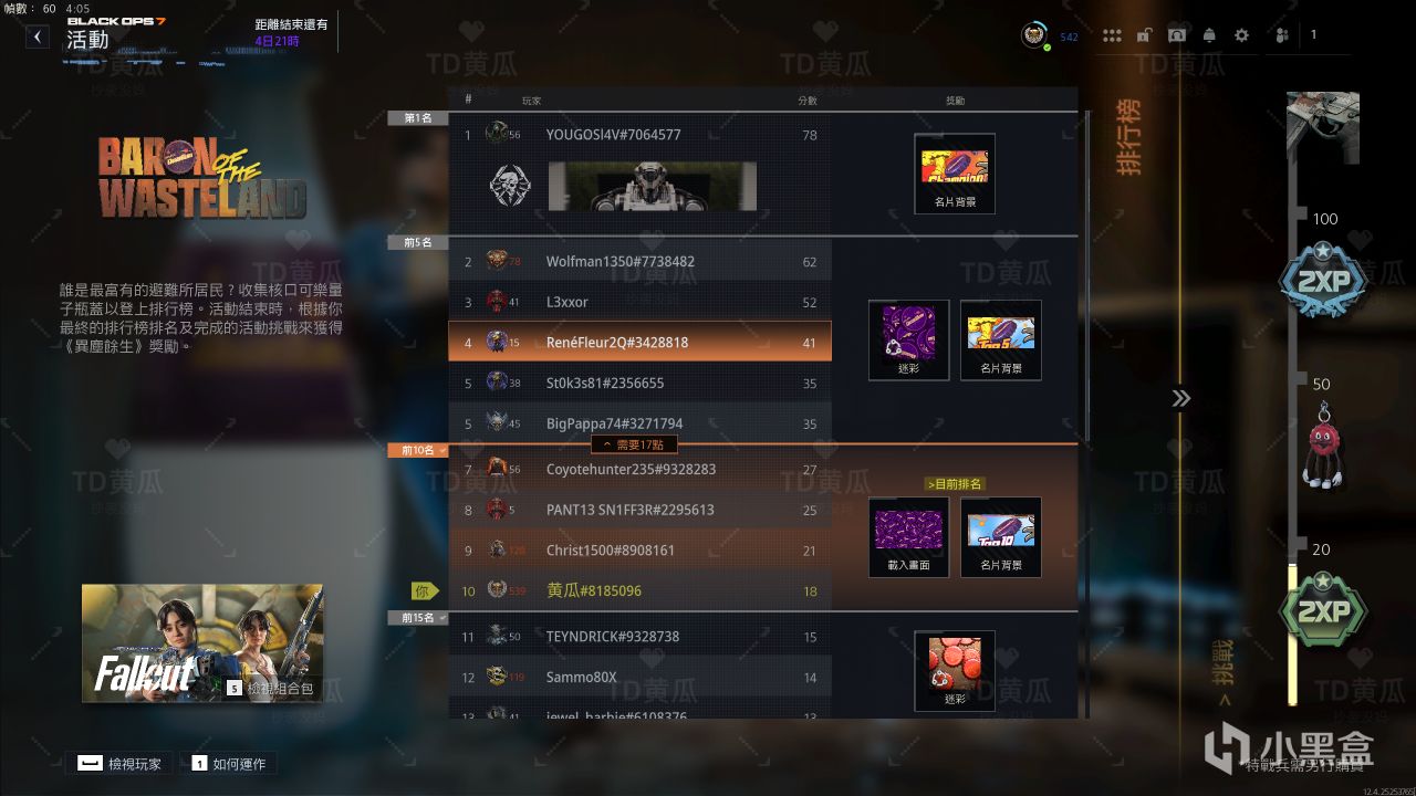 “廢土男爵”排行榜活動現已上線,1月21日之前,通過拾取瓶蓋,達到對應瓶蓋數即可獲得Peacekeeper MK1藍圖、掛飾和雙倍經驗代幣。