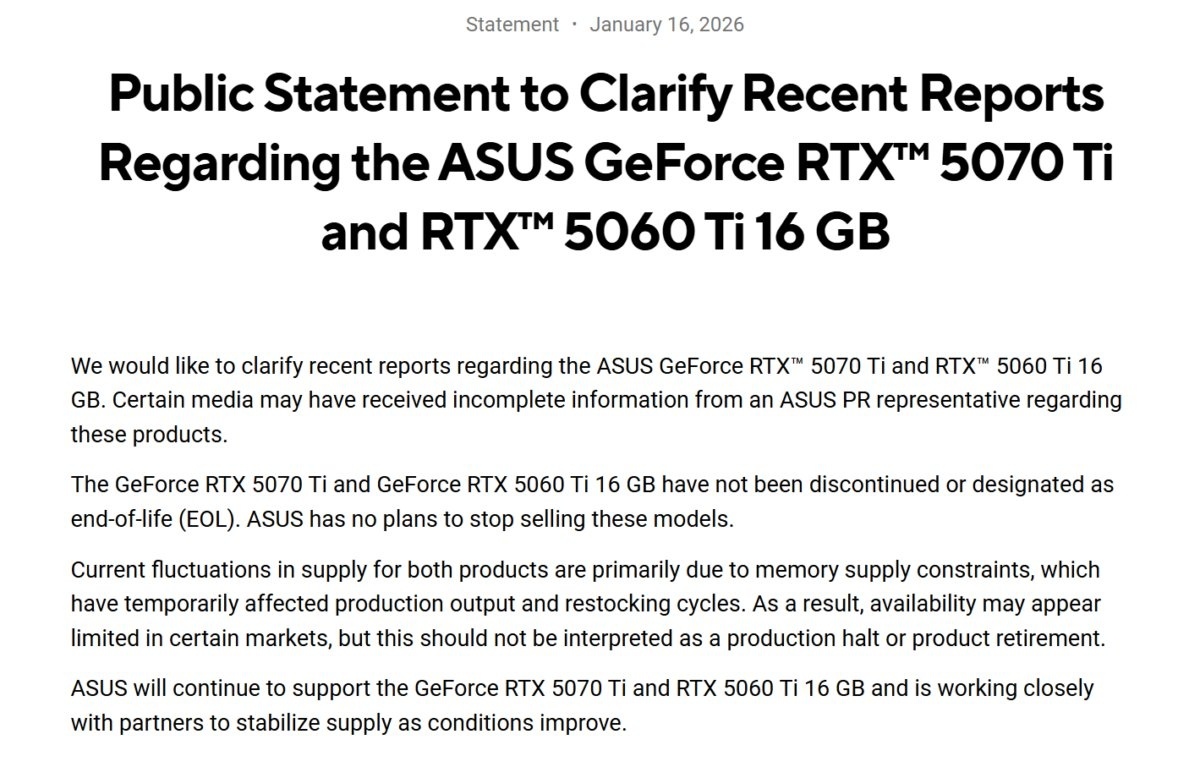 “针对近期有关华硕GeForce RTX 5070 Ti和RTX 5060 Ti 16GB的相关报道,我们特此澄清:部分媒体可能从华硕公关代表处获取了不完整信息。