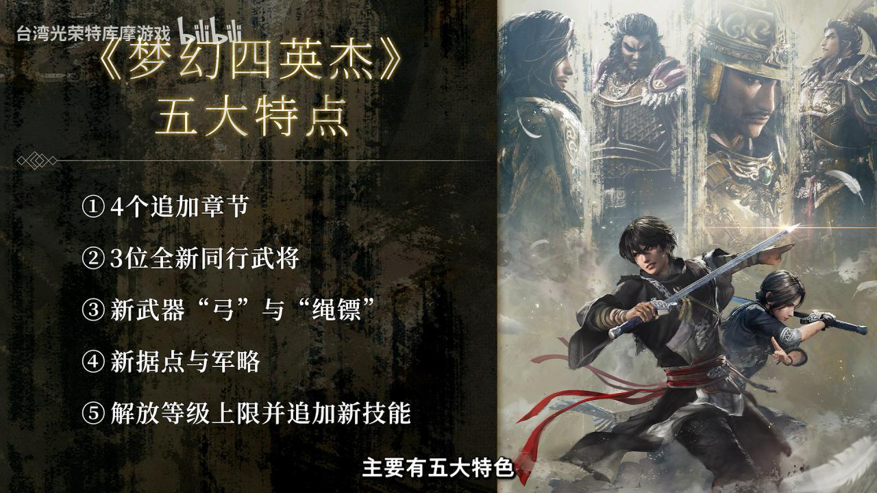 《梦幻四英杰》特别节目公开:追加4个章节、解放等级上限等 2026-01-16 PC游戏 《梦幻四英杰》五大特点:4个追加章节3位全新同行武将新武器“弓”与“绳镖”新据点与军略解放等级上限并追加新技能 更多游戏资讯请关注:电玩帮游戏资讯专区 电玩帮图文攻略 www.vgover.com