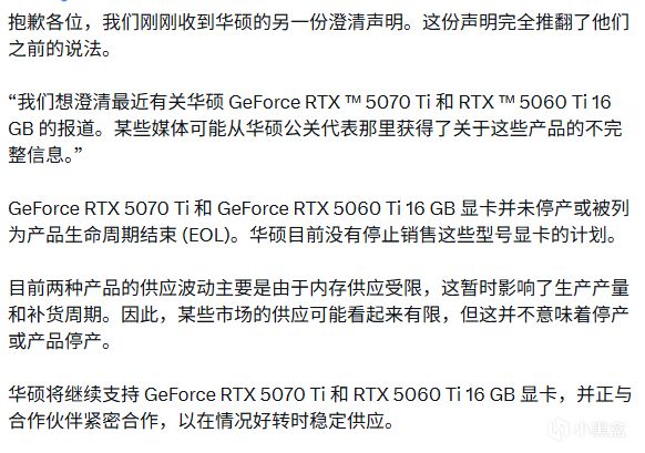 然而,1月16日更新消息显示,华硕向Hardware Unboxed发表新声明,明确表示并未计划停止生产RTX 5070 Ti及RTX 5060 Ti 16GB型号,并撤回此前说法。Hardware Unboxed则回应称,无法判断哪一方声明更准确,将在未来数月继续关注RTX 5070 Ti的实际供应情况。