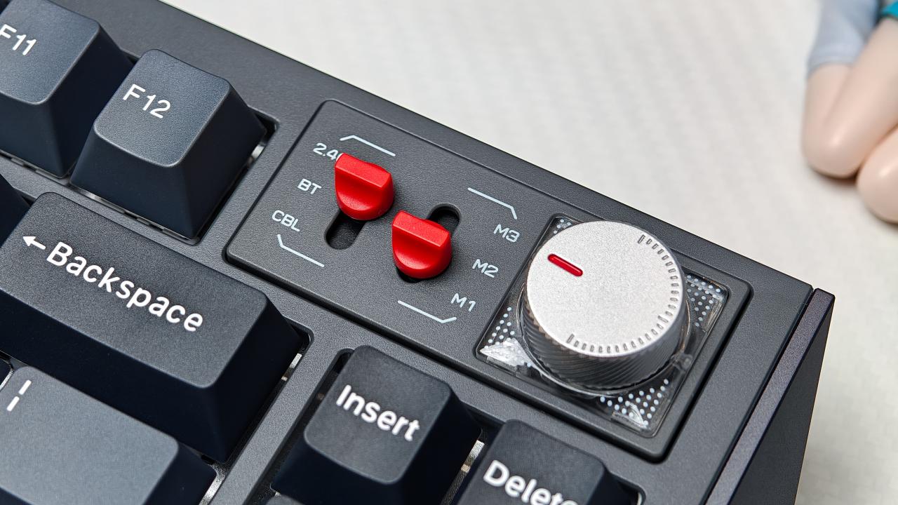 旁邊的撥杆也很有感覺,快捷切換連接模式,右邊的M123可以綁定不同的配置,還能預設參數,比我就是把M1設置成MAC操作系統,M2設置成WIN系統,在兩個系統來回之間切換的時候就很方便,