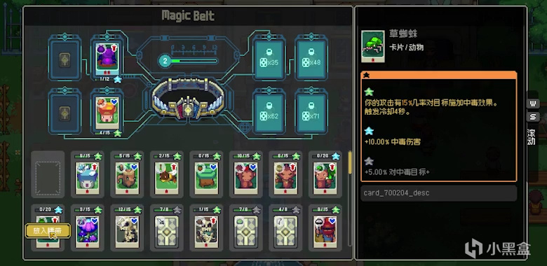 游戏内还有魔法腰带,每个怪物都会掉落专属素材,可以用来解锁魔法卡片,在魔法腰带上插入魔法卡片可以获得被动能力,比如增加输出、提高资源获取率以及特殊加成等。