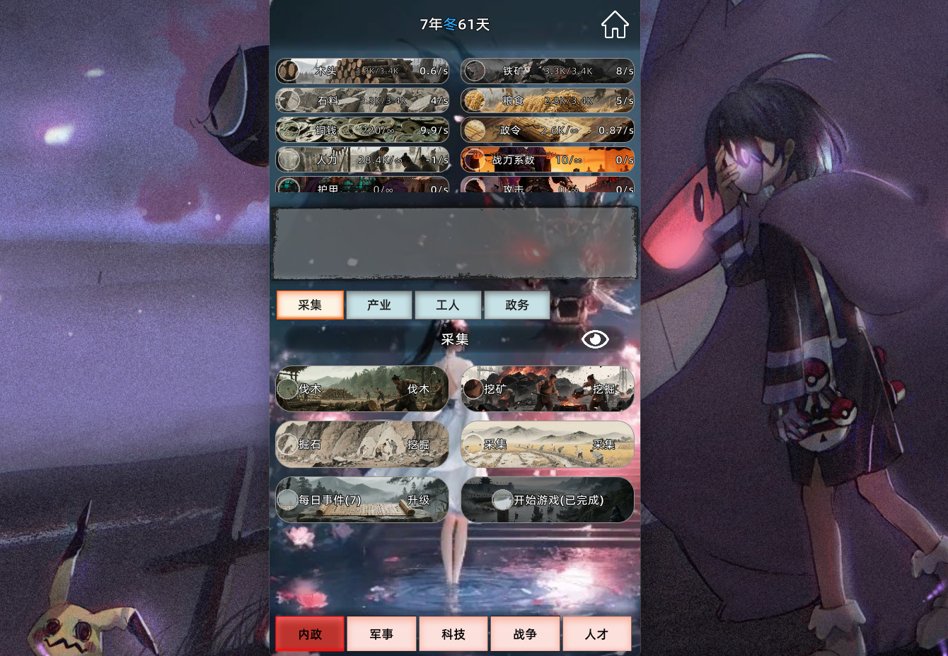 在【万界贸易】里,甚至可以实现模拟旅行和贸易,在【喵国建设者】里,用数值的周期变化来实现季节的更替,用季节来影响资源或者其它功能。